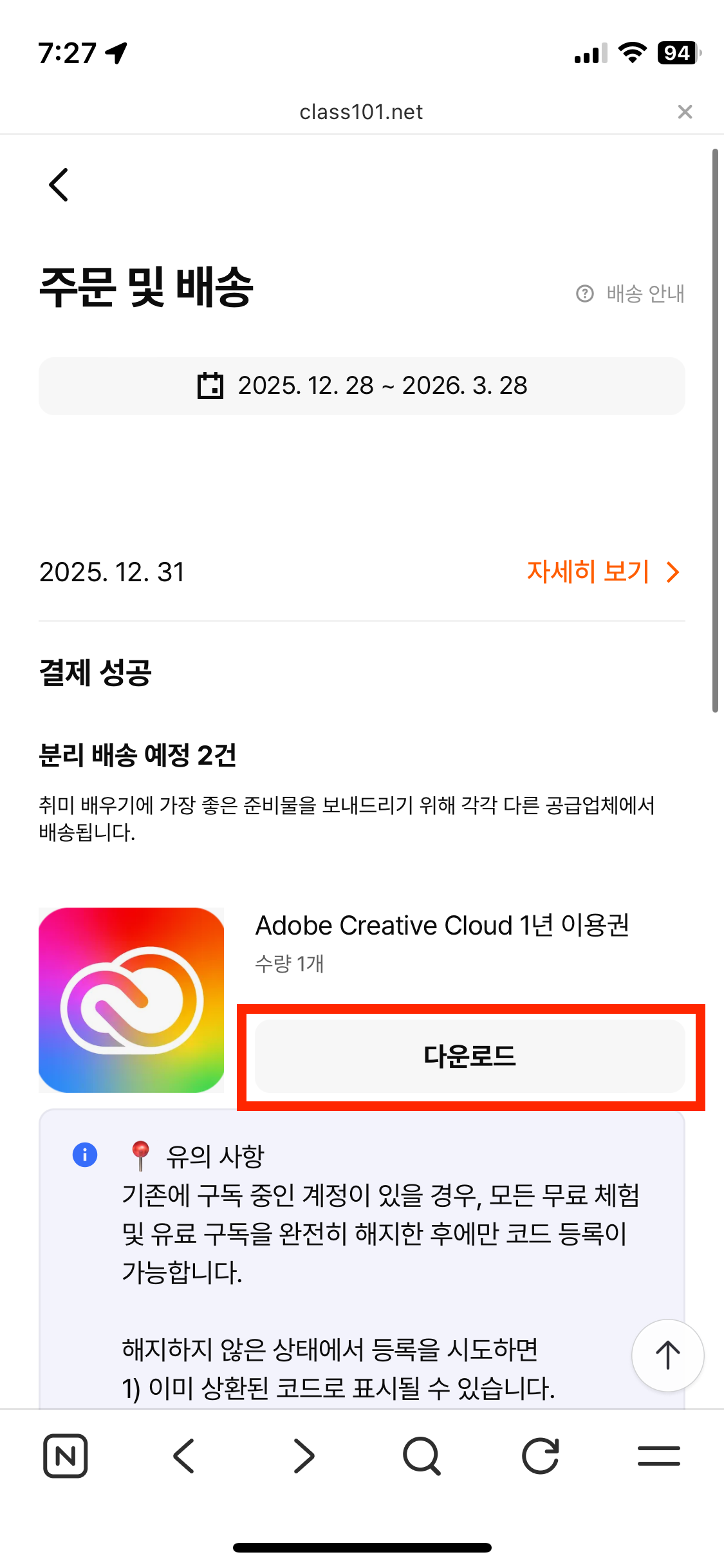 1년 동안 클래스101의 강의들을 구독할 수 있고, 어도비 크리에이티브 클라우드 모든 앱들도 사용할 수 있도록 코드가 발급되어서 한 달에 39000원에, 어도비 프로그램도 사용하고 클래스101의 거의 모든 강의도 볼 수 있어서 정말 유익한 프로모션입니다.