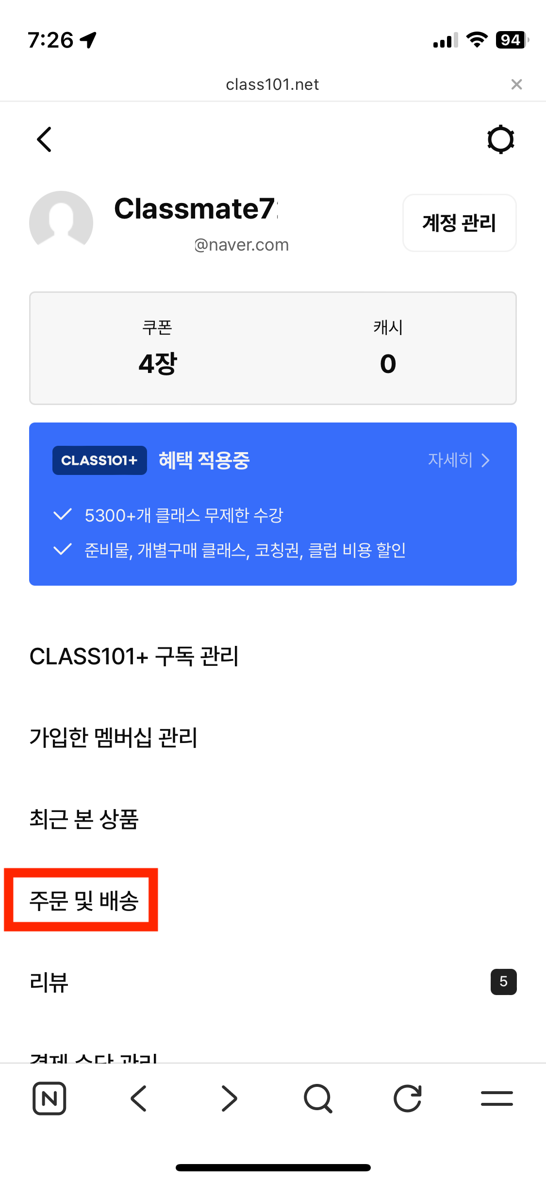 2. 계정 관리 페이지에서 주문 및 배송 메뉴를 클릭합니다.