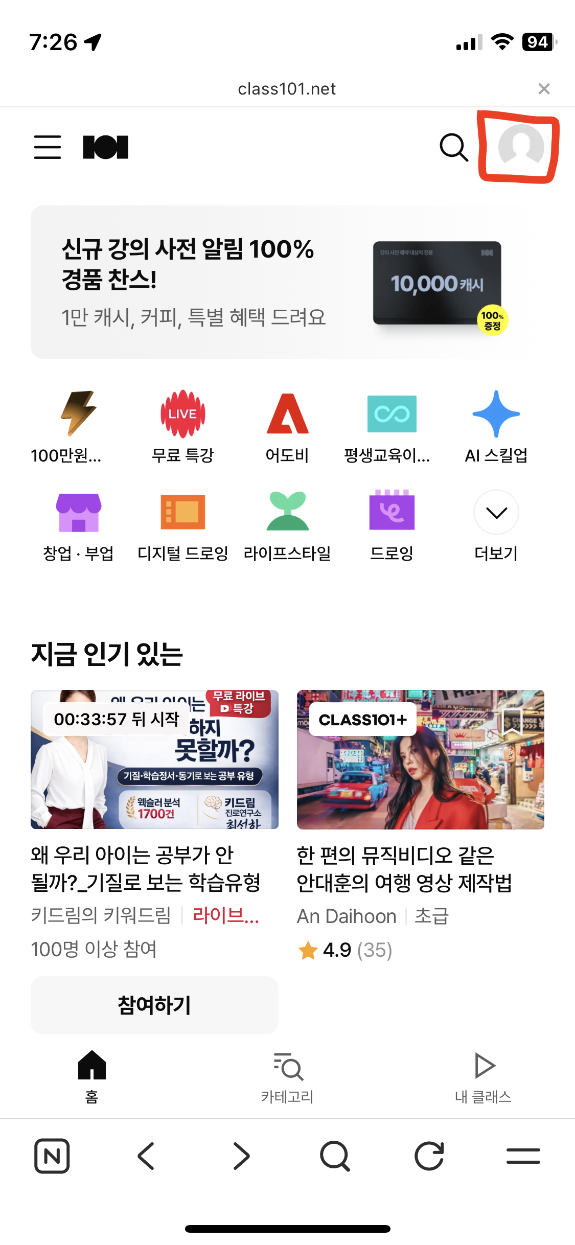 1. 먼저 클래스101 사이트에 로그인을 하고 오른쪽 상단 프로필 이미지를 클릭합니다. PC에서 인터넷을 접속해도 되지만 저는 스마트폰으로 인터넷에 접속했습니다.