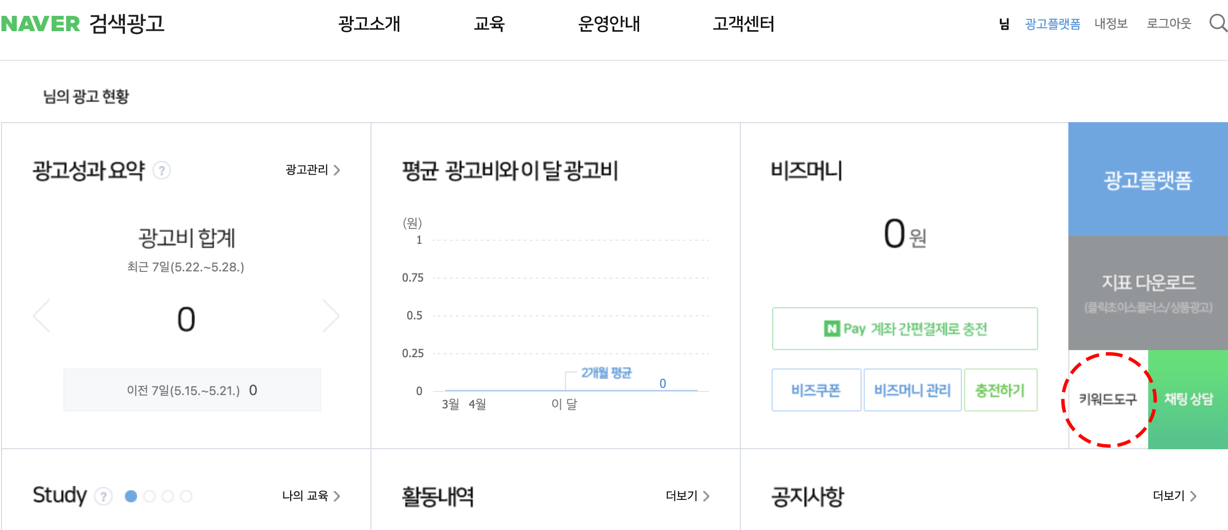 2단계 네이버 검색광고 사이트 첫 화면 오른쪽에 키워드 도구를 클릭합니다.