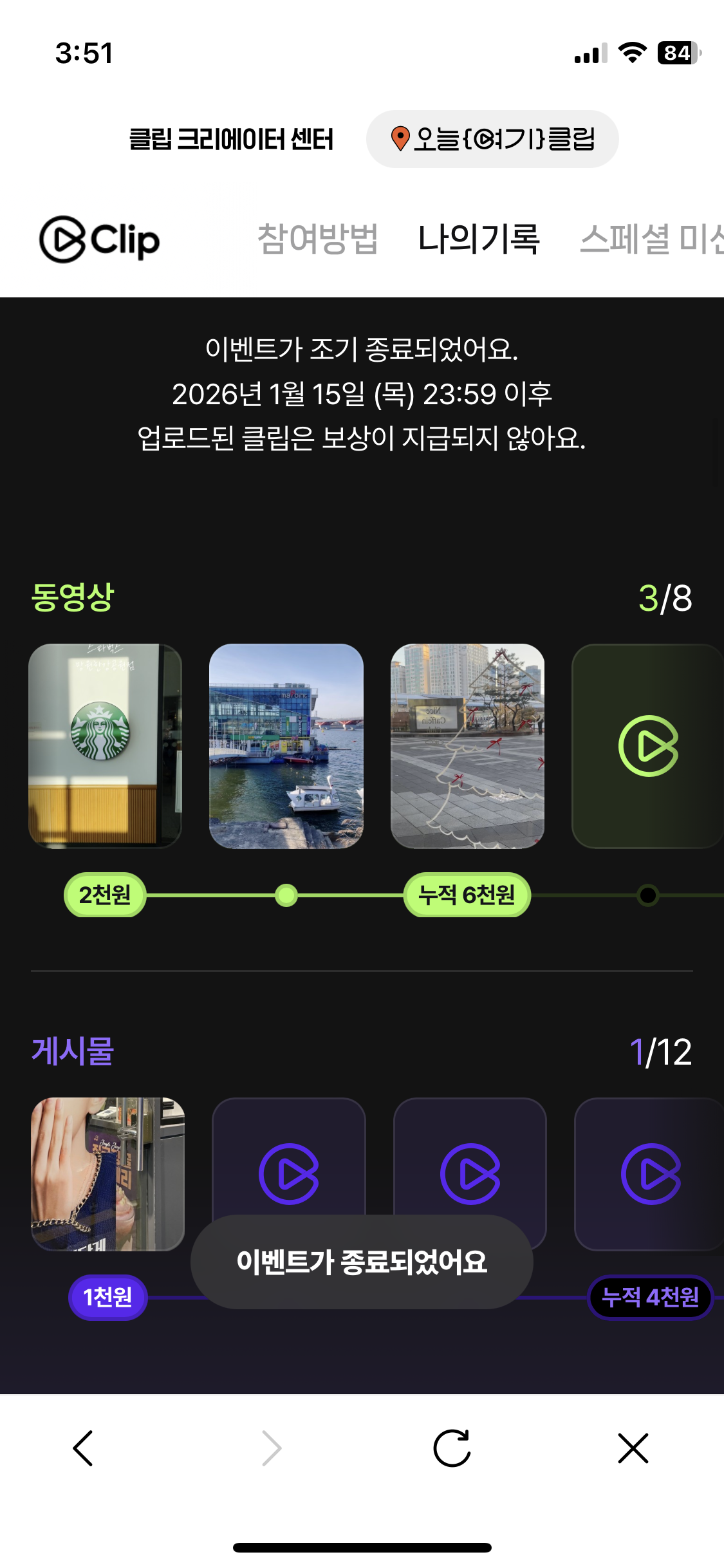 위의 2개의 이미지는 제가 2026년 1월 17일에 캡처한 이미지입니다. 이 날 확인해보니 이미 이틀 전인 1월 15일에 챌린지가 종료되어 있었습니다. 1월 초반에 동영상 3개와 게시물 1개를 올려서, 그나마 부분적으로는 네이버페이를 받을 수는 있었지만, 조금 아쉬웠습니다. 1월에는 동영상 3개로 6천원을 게시물 1개로 1천원을 받을 수 있어서, 7천원은 그래도 받을 수 있을 것 같습니다.