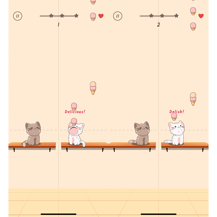 듀엣 캣츠는 쉽고 간단한 게임입니다. 팝 위주의 음악에 맞춰 떨어지는 아이스크림을, 고양이 두 마리를 양손으로 드래그하여 움직여 먹여주면 됩니다. 그 타이밍에 맞춰 고양이들이 아이스크림을 먹으며 야옹 야옹 허밍합니다. 고양이들이 깜찍합니다. 꼬리를 흔들 거나 아이스크림을 먹기 위쪽을 바라 보고 입을 크게 벌리는 모습이 특징입니다.