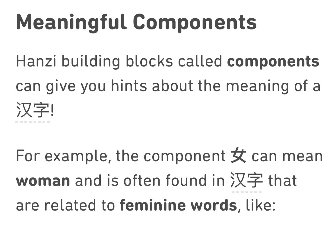 예를 들어 女는 여자를 뜻하고 女는 여성적인 단어와 관련된 한자에서 많이 발견됩니다.