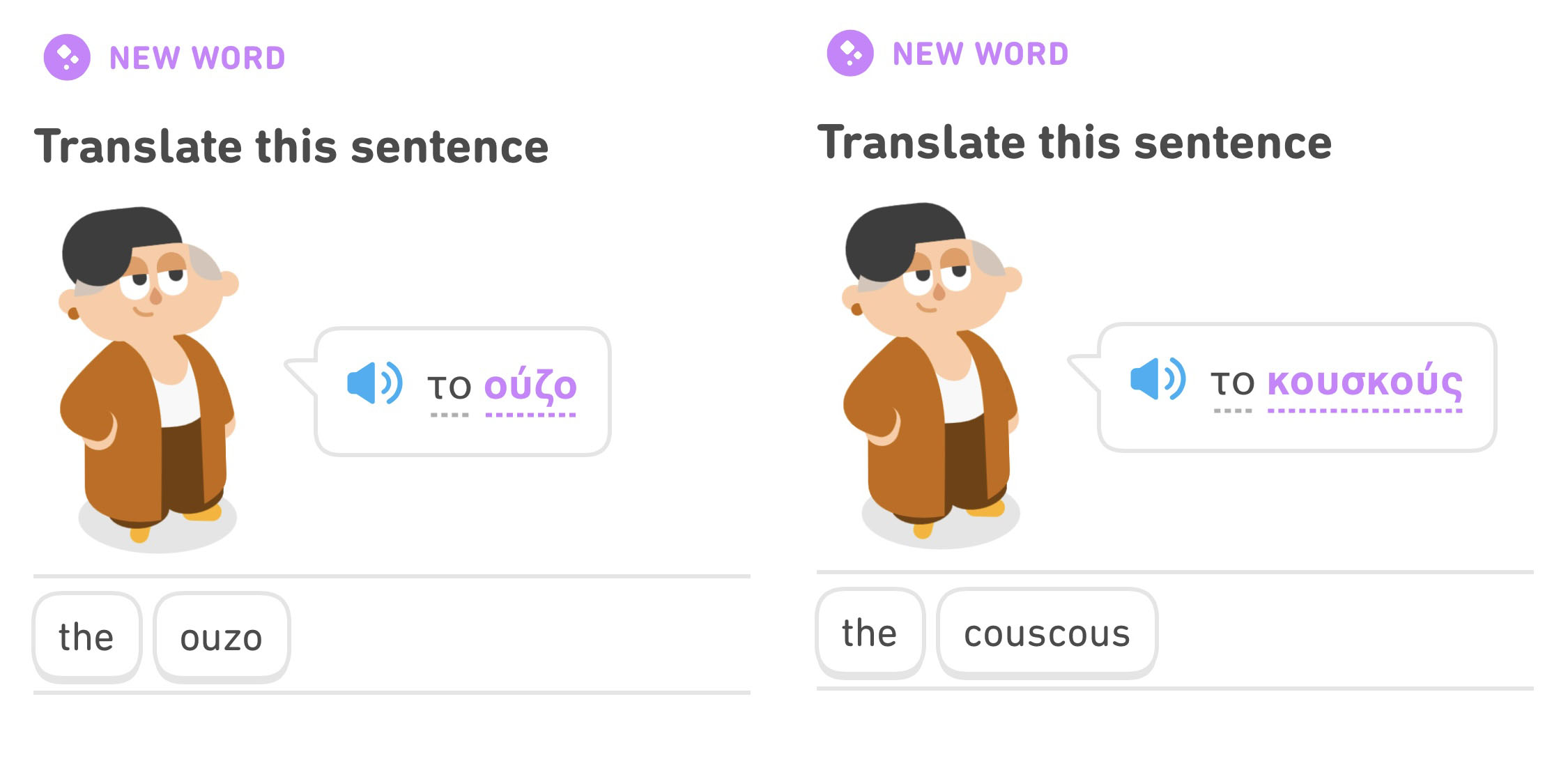 듀오링고 그리스어 학습에서 새로운 단어로 ouzo와 couscous를 배웠습니다. 영어 ouzo는 그리스어로 Ούζο입니다. 그리고 영어 couscous는 그리스어로 κουσκούς입니다.
