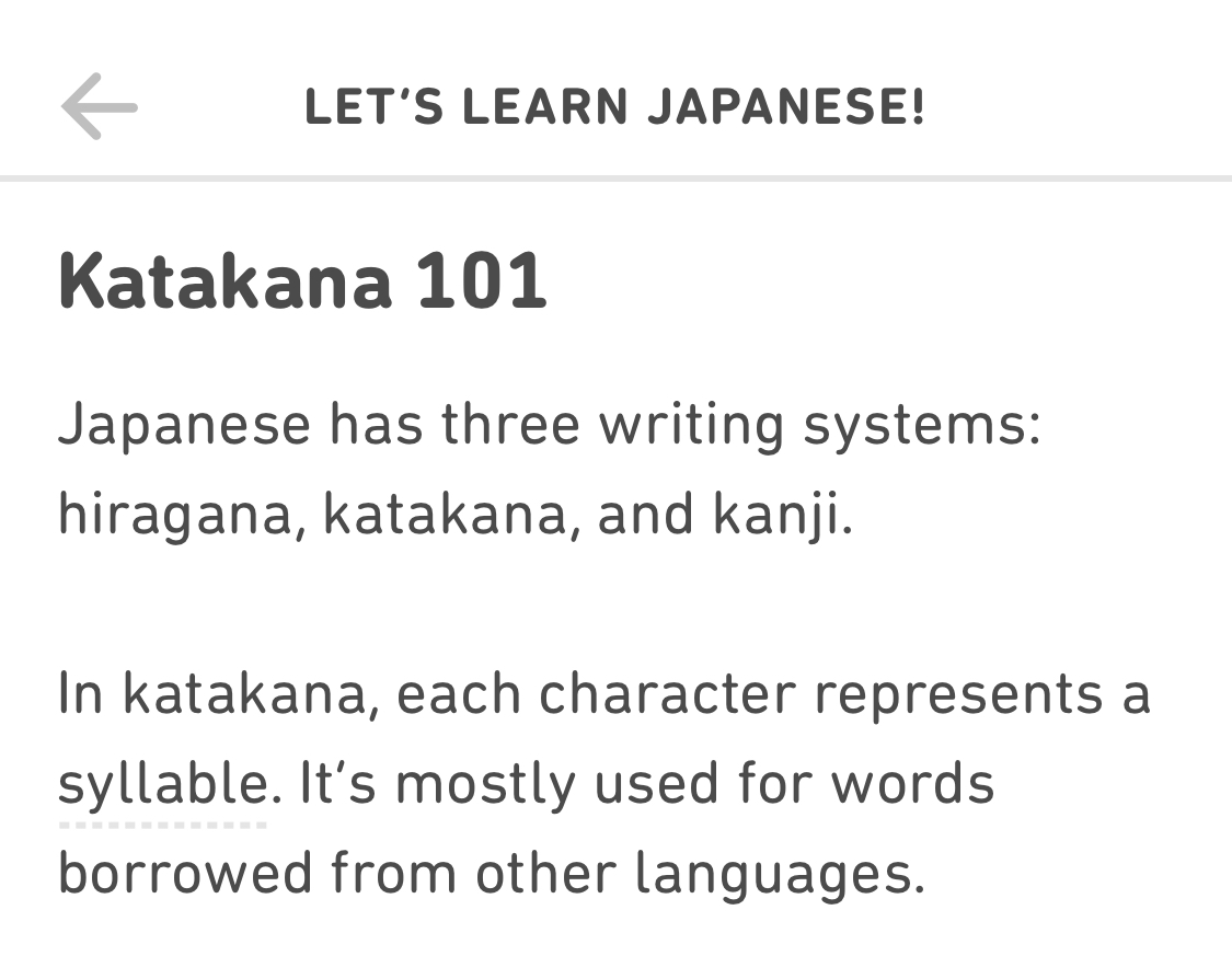 듀오링고 일본어 학습 모드에서는 섹션2 유닛2에서 카타카나 학습이 시작되었습니다. 학습 맵을 보면 문이 열린 그림이 있습니다. 카타카나 학습 25개 레슨을 끝마쳐야만 문이 열리고 다음 코스로 넘어갈 수 있었답니다. 반복에 반복을 더해 학습량이 정말 많은 것 같습니다.
