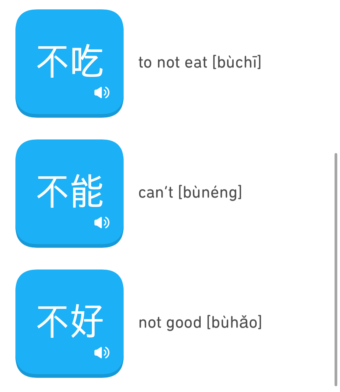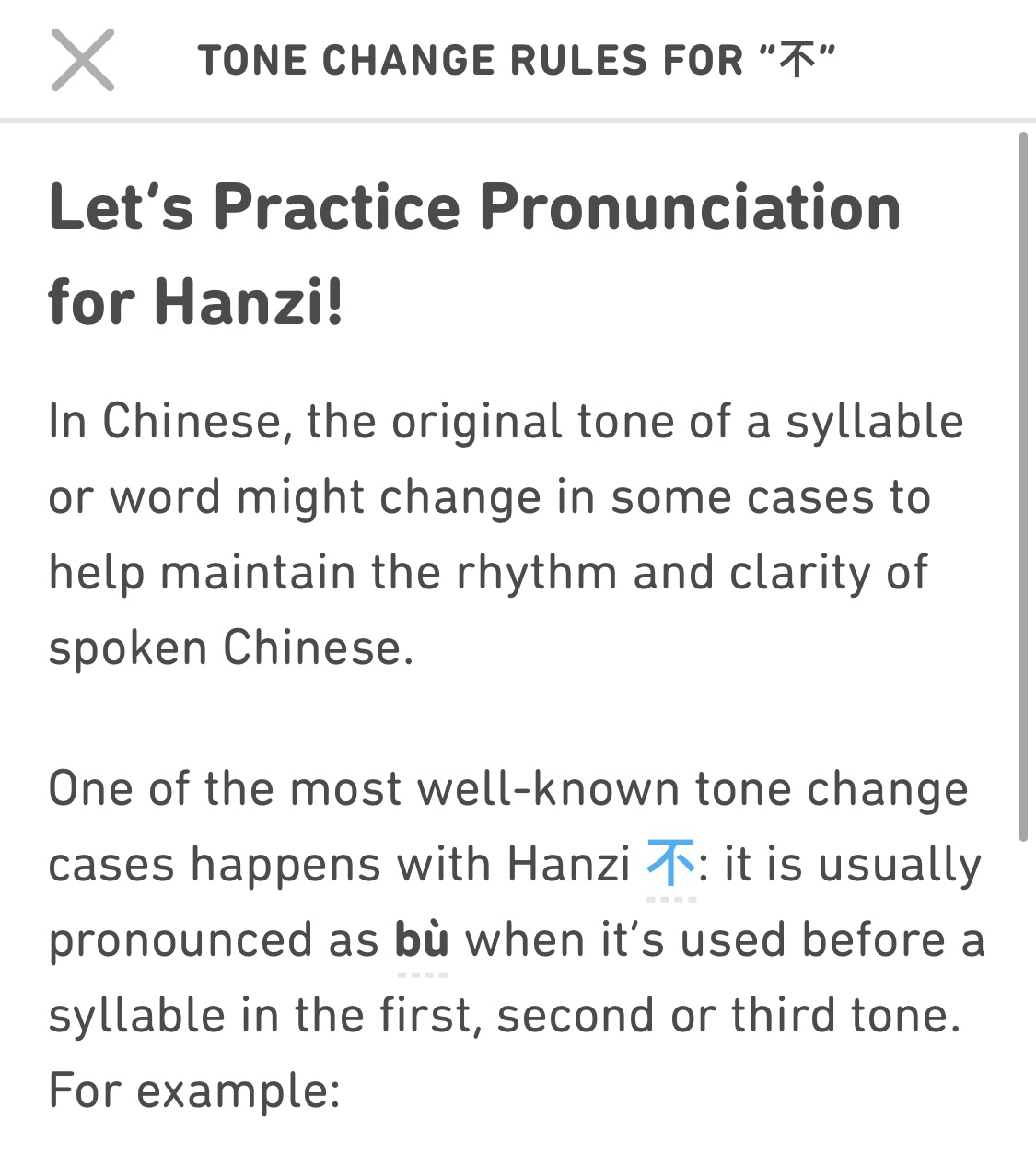 중국어에서는 한자의 기본 성조가 (tone) 경우에 따라 변합니다. 분명한 리듬으로 말을 하기 위해서입니다. 가장 유명한 성조 변화 케이스는 한자 不입니다. 不는 첫 번째, 두 번째, 세 번째 성조 앞에 쓰일 때 보통 bù로 발음됩니다. bú