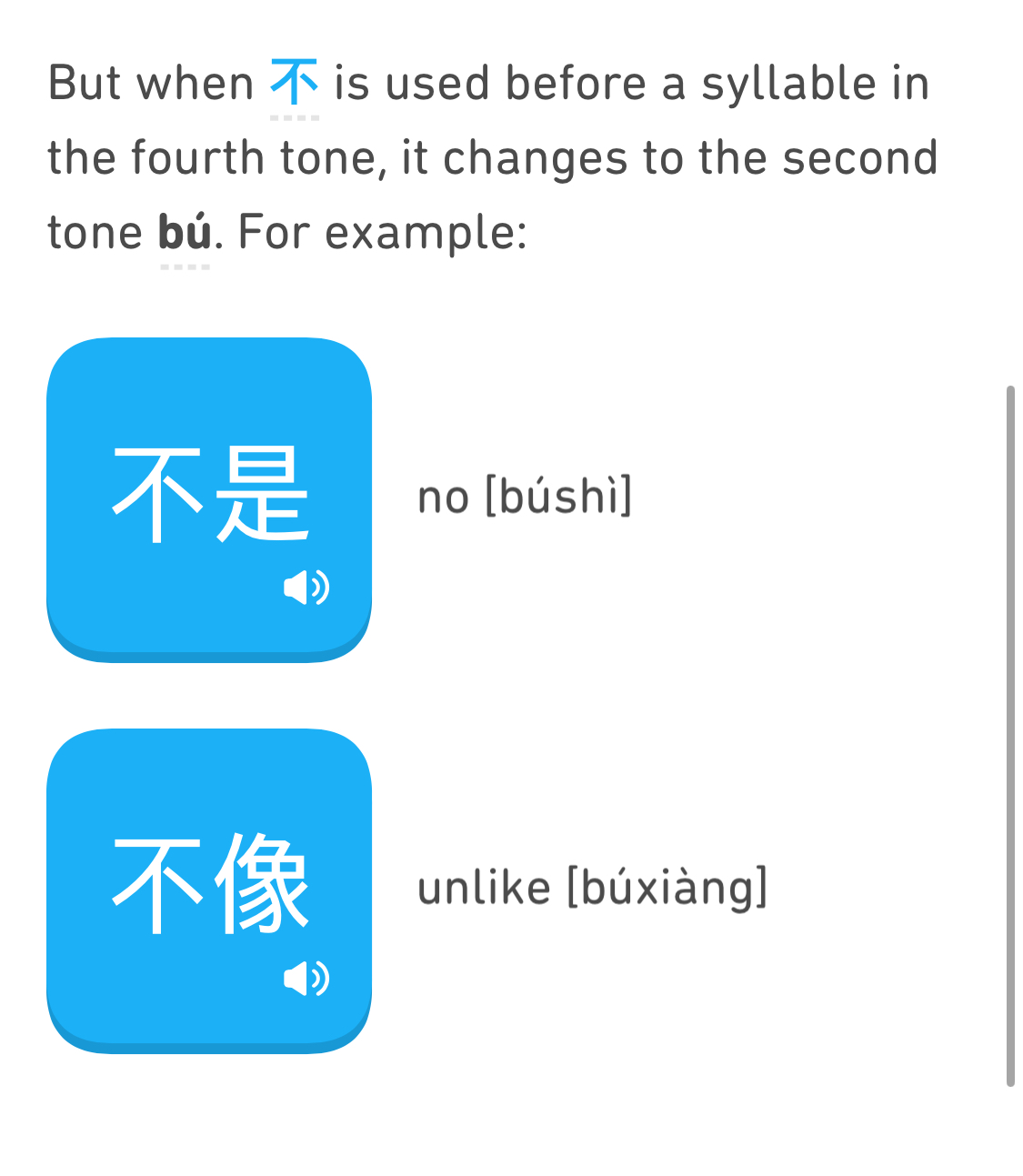 중국어에서는 한자의 기본 성조가 (tone) 경우에 따라 변합니다. 분명한 리듬으로 말을 하기 위해서입니다. 가장 유명한 성조 변화 케이스는 한자 不입니다. 不는 첫 번째, 두 번째, 세 번째 성조 앞에 쓰일 때 보통 bù로 발음됩니다. bú