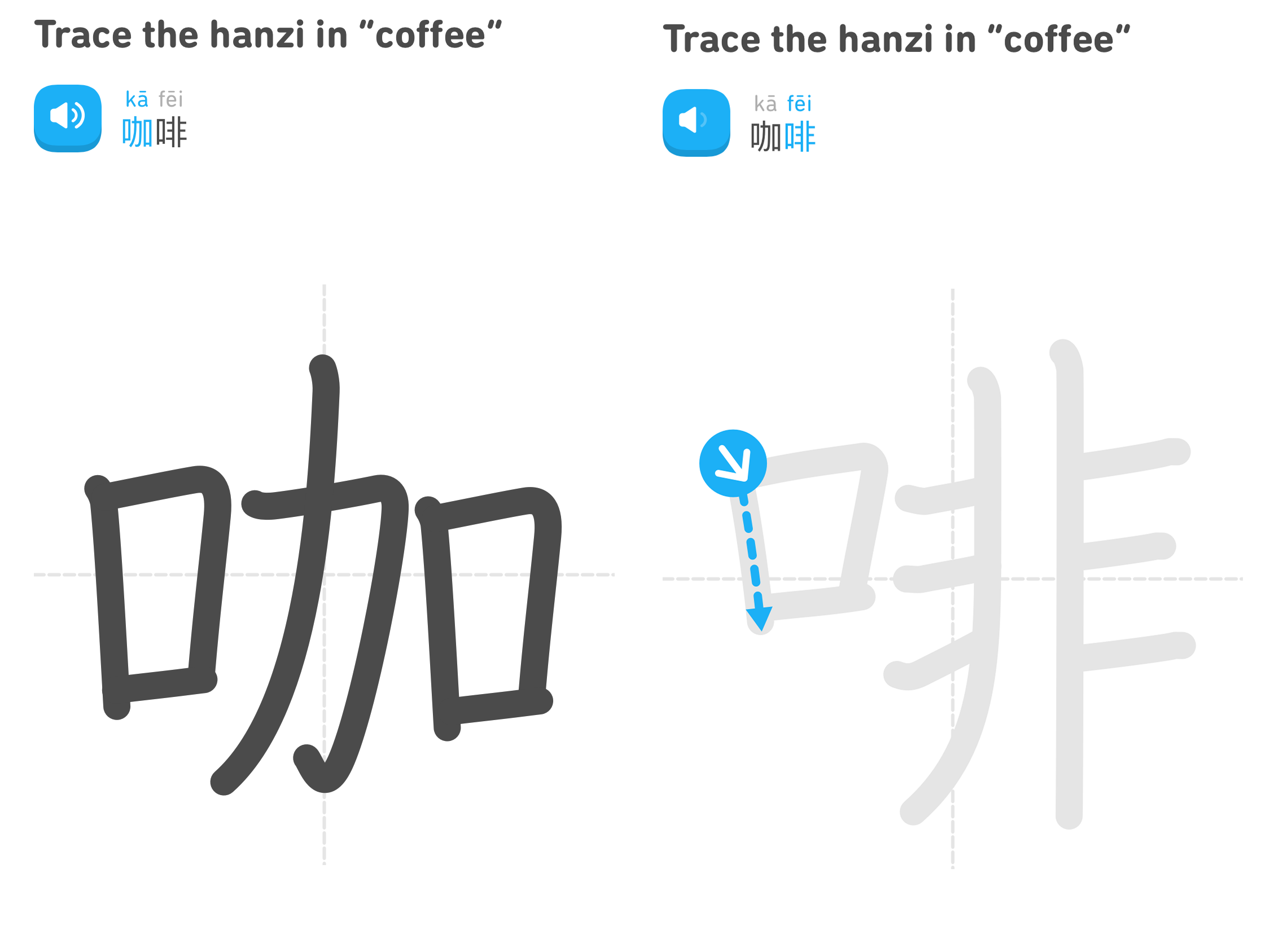 이렇게 글자를 한 획 한 획 써볼 수 있게 학습을 제공합니다. 커피는 입으로 마시는 음료라서 그런지 단어에 한자 kǒu가 많이 들어갑니다.