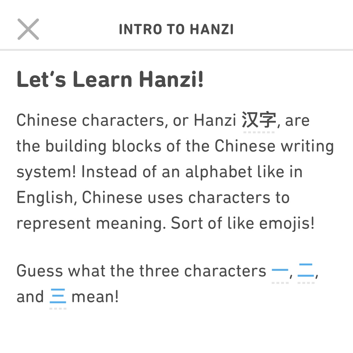다양한 나라의 언어 학습을 무료로 지원하는 듀오링고 앱에서 중국어를 시작했습니다. 개인적으로 듀오링고로 공부하는 여섯 번째 언어입니다. 영어, 프랑스어, 수학, 음악, 일본어, 하와이어의 순서로 시작해서 중국어를 시작했습니다. 수학과 음악도 언어라고 생각했습니다. 수학은 숫자 언어, 음악은 음표 언어라고 생각해서 언어에 포함했습니다. 중국어 다음으로도 경험해보고 싶은 언어들이 많습니다. 지금까지 공부한 언어들은 하와이어를 제외하고는 강의로든 책으로 독학으로든 학습 경험이 있는 언어들입니다. 하지만 하와이어처럼 생판 몰랐던 언어들이 아직도 많이 남아 있고 미지의 언어들도 욕심이 납니다.