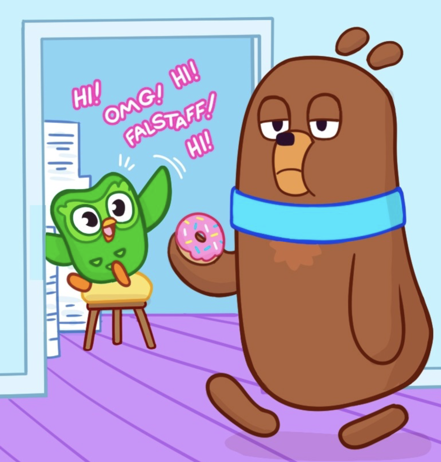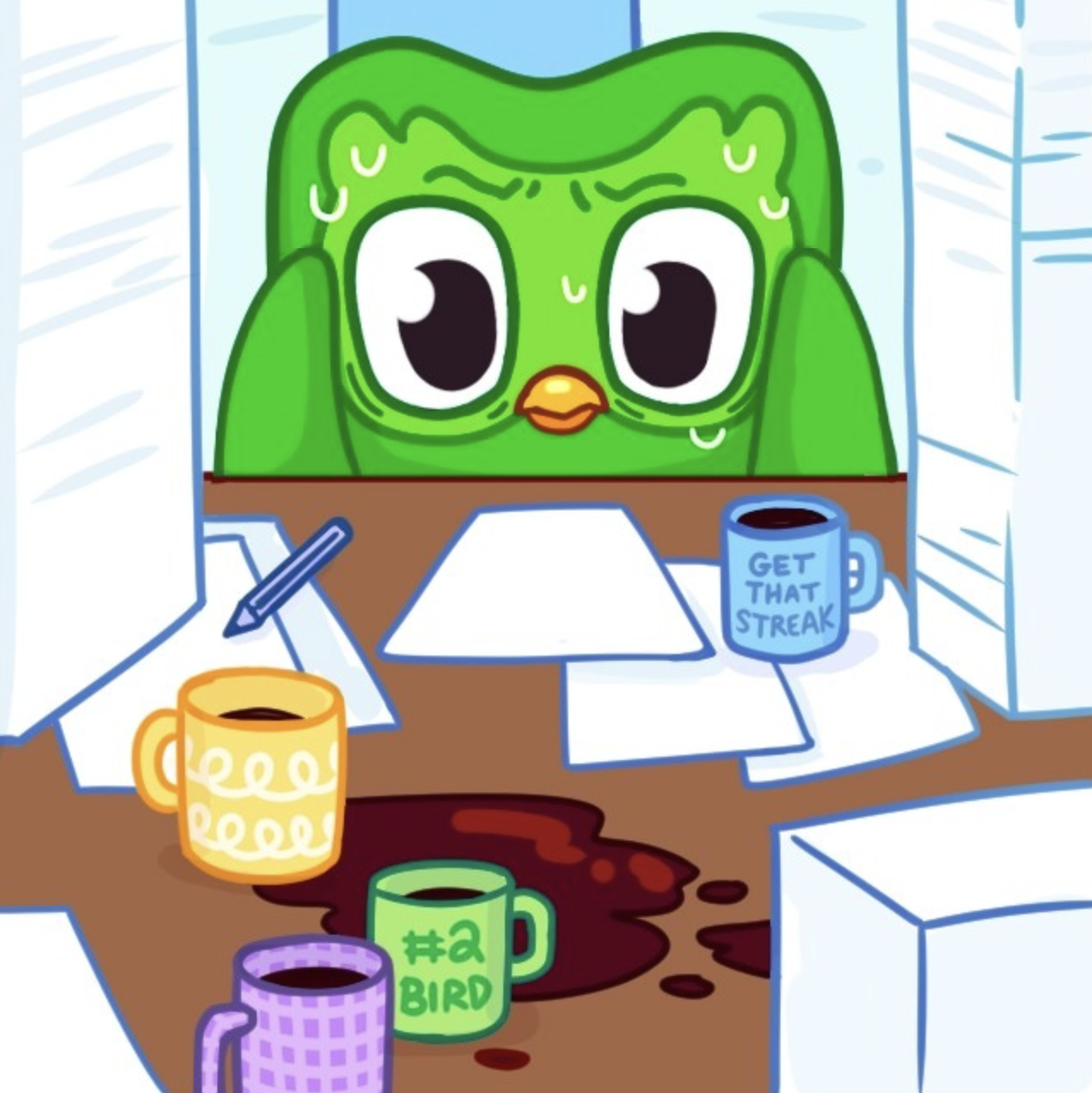듀오링고 본사에서 듀오가 모든 사람이 배우기를 바라지만 마감기한을 넘겨도 일이 끝나지는 않고 격무에 시달립니다. 직원인 Falstaff(폴스타프)라는 곰에게 조수를 구해달라고 돈 뭉치를 줍니다. 폴스타프는 돈을 세며 그 돈을 조수를 구하는 데에 쓰지 않고 어떻게 하면 0원으로 즉 돈을 들이지 않고 조수를 구할 수 있을까 하고 고민합니다. 그때 수리실에 방치된 clone machine (클론 머신)을 발견합니다. 듀오가 이 클론 머신을 작동시켜보자고 본인이 그곳에 들어갑니다. 그런데 정말 클론 머신이 작동해 복제된 듀오가 만들어 졌습니다. 듀오는 I've always wanted to do that.이라고 말하며 복제된 듀오 이마에 사인펜으로 숫자 2를 적고, 복제된 듀오를 Twuo라고 부릅니다. 하하. 그리고 투오는 듀오를 보스(boss)라고 부르고 듀오는 투오에게 어서 클론 머신에 들어가라고 합니다. 곰 폴스타프는 투오를 클론머신 안에 찍어댔는데 너무 많은 듀오가 만들어져서 본사 밖으로 튕겨져 나갔고 회사에 불이났습니다. -끝-