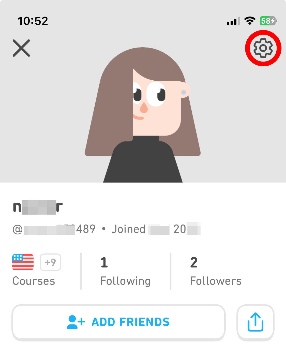 1. 듀오링고의 자기 프로필 화면의 상단 오른쪽을 보면 톱니 바퀴 모양의 설정 버튼을 누릅니다.