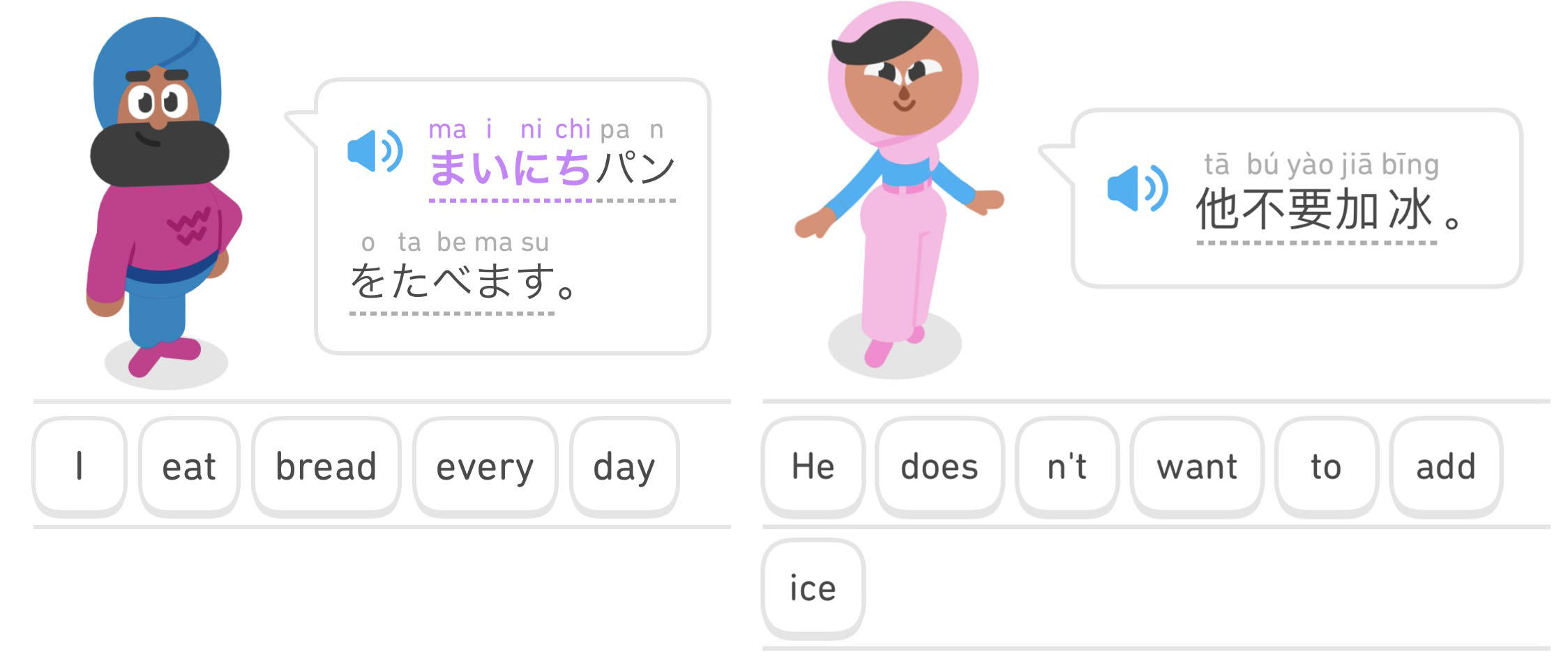 듀오링고 일본어와 중국어 학습 코스에서는 글자 위에 발음을 표시해 줍니다. 왼쪽 캐릭터 비크람은 현재 일본어로 말을 하고 있는데요. 일본어 글자 위에 발음 표시가 있어서 학습자는 글자를 몰라도 발음 표시를 보고 읽을 수 있게 됩니다. 마이니치팡오타베마스. 라고 말하고 있습니다. 오른쪽 캐릭터 자리는 중국어로 말하고 있으며 타부야오쨔빙. 이라고 말하고 있습니다. 그런데 좀 더 어드벤스드하게 공부하기 위해 글자 위의 발음 표시를 안 보이게 비활성화 시켜 끌 수 있습니다. 그 방법을 보여드리겠습니다.