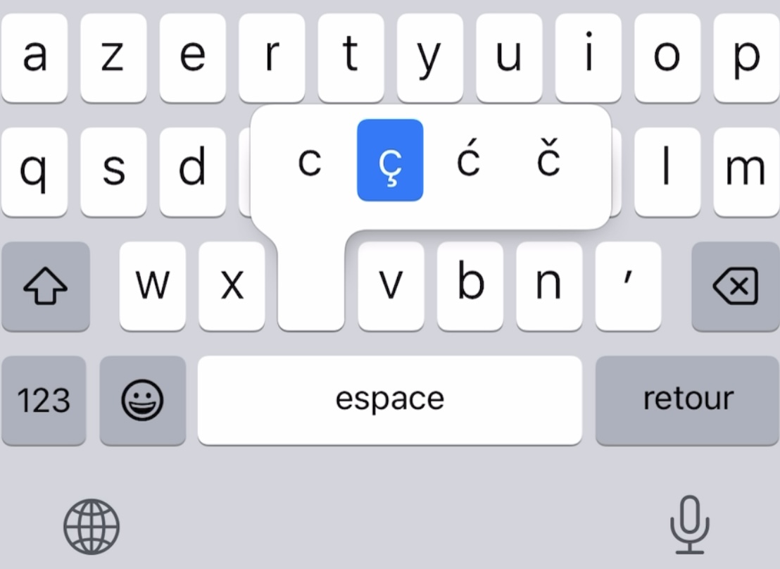 ç를 쓰고 싶을 때 자판의 c를 꾹 누르면 몇가지 옵션이 뜹니다. 그리고 ç 말고도 자판 c 옆으로 4칸을 더 가서 보면 작은 따옴표 자판이 있는데 이것 또한 꾹 누르면 몇 가지 엑센트 옵션이 동일하게 뜹니다.