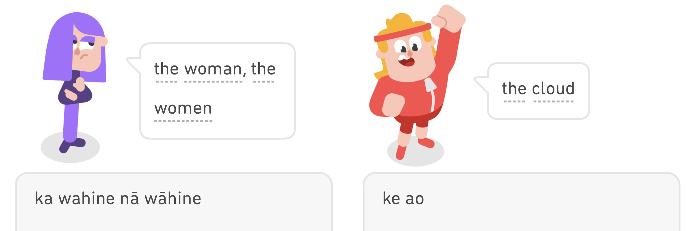단수 명사 wahine (woman, 여자) 앞에는 ka가 왔고 복수 명사 wāhine (women, 여자들) 앞에는 nã가 왔습니다.