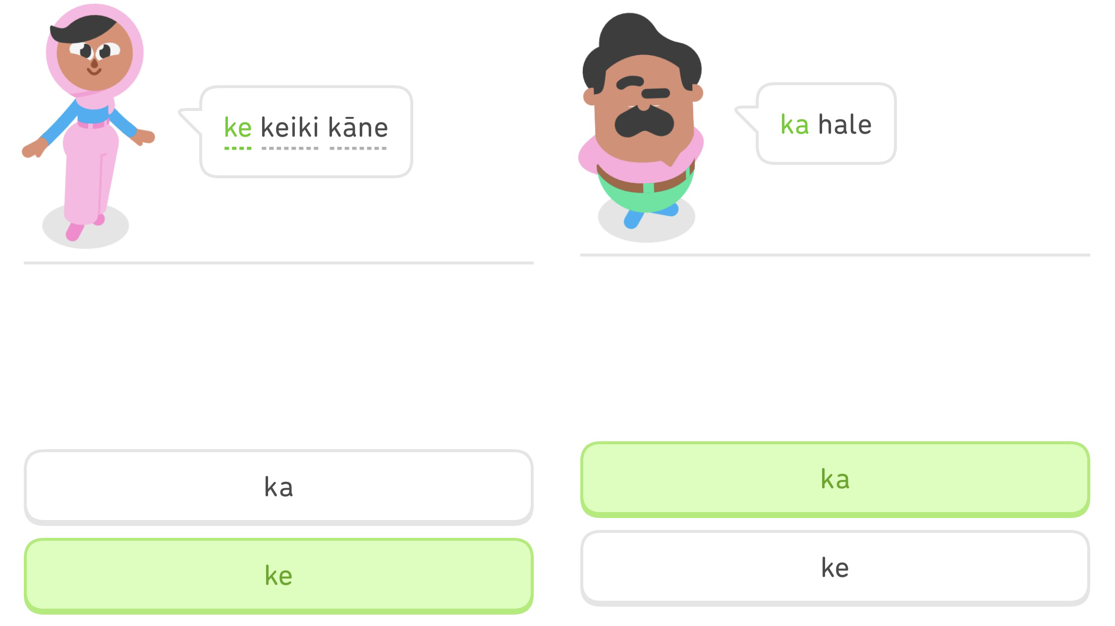 keiki kāne는 아들을 뜻하는 son이고 [케이키 카네]라고 발음합니다. 단수 단어이고 k로 시작하는 단어라서 앞에 정관사로 ke가 왔습니다. hale는 집을 뜻하는 house이고 k, e, o, a가 아닌 h로 시작하는 단어라서 앞에 정관사로 ka가 왔습니다.