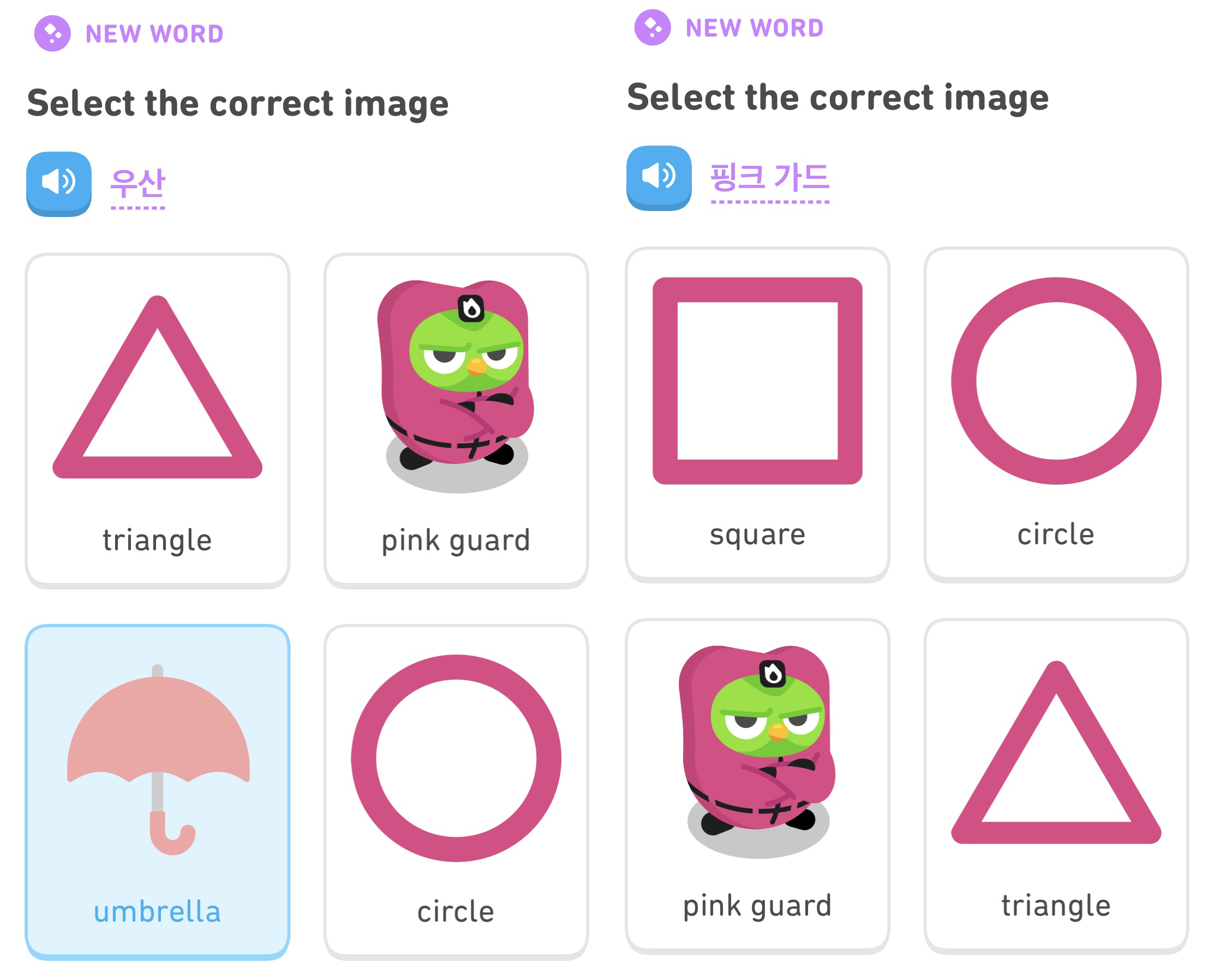 듀오가 핑크가드 의상을 입고 있고 오징어 게임의 시그니처 세모 네모 동그라미 모양도 있어서 비주얼이 예쁩니다. 그리고 오징어 게임의 주인공 성기훈이 오징어 게임 시즌1 달고나 게임에서 뽑았던 우산도 오징어 게임의 상징으로 문제에 출제 되었습니다. 그런데 저는 핑크가드가 아니라 핑크솔저 (pink soldier)로 알고 있었는데, 듀오링고에서는 영어로 pink guard로 표현하고 있습니다.