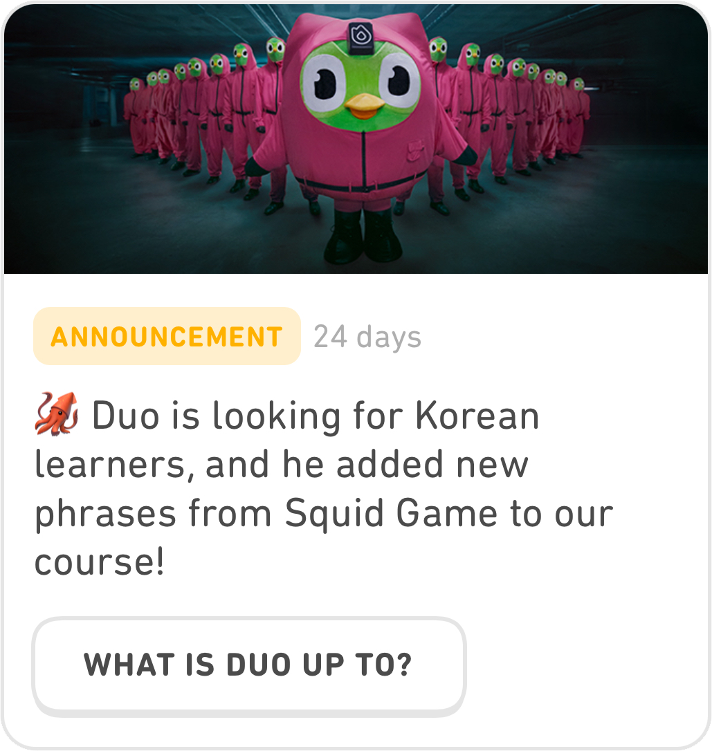 2024년 12월 26일 넷플릭스에서 오징어 게임 시즌2가 공개되었는데요. 트렌드를 따라가는 듀오링고 한국어 학습 코스에서도 오징어 게임과 콜라보레이션을 했습니다. 한국어 코스에서 오징어 게임에서 나온 표현들을 볼 수 있습니다.
