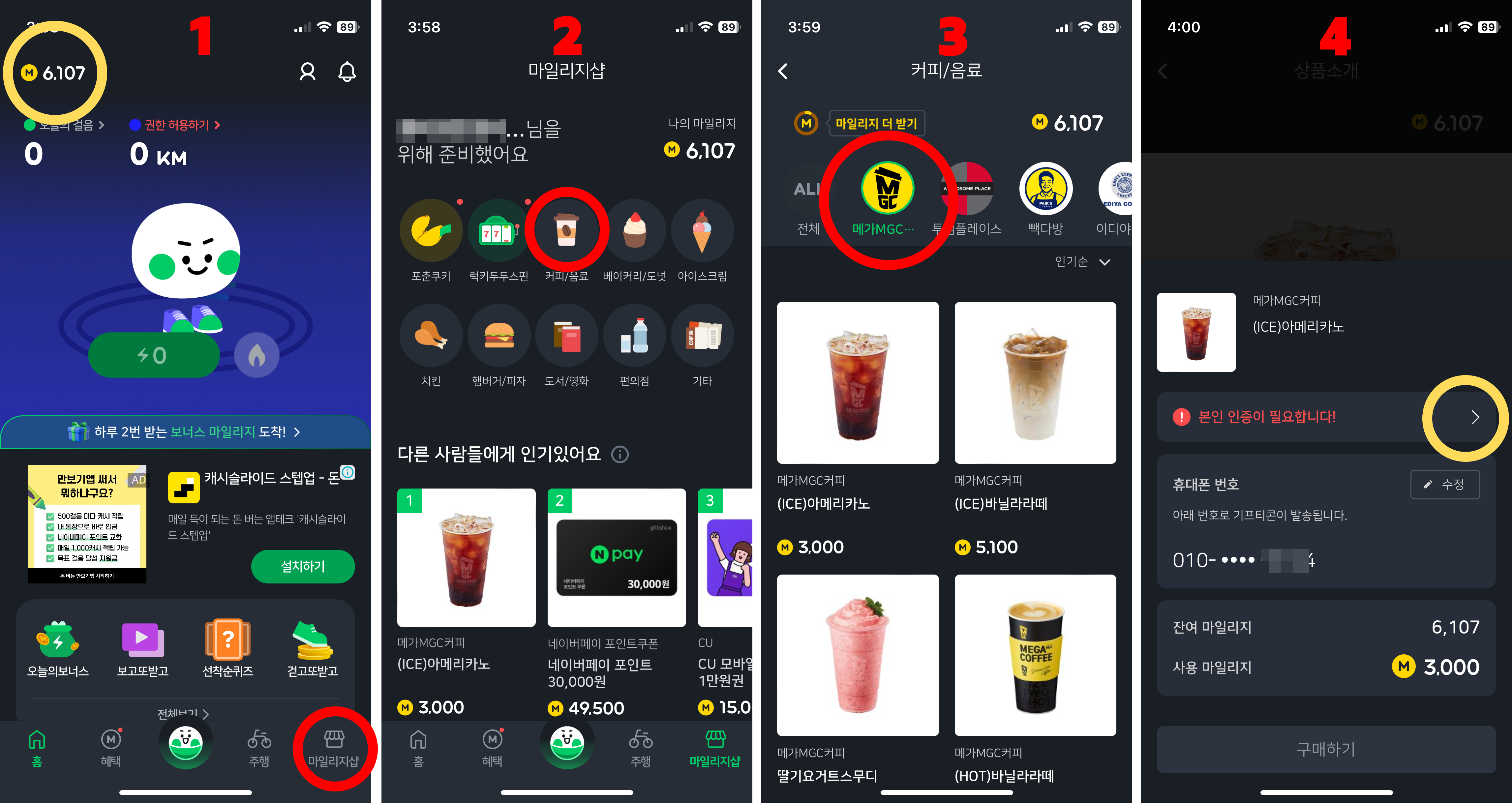 1. 화면 상단 왼쪽에 6107마일리지가 모여 있는데요. 화면 하단 오른족에 마일리지샵을 클릭합니다.