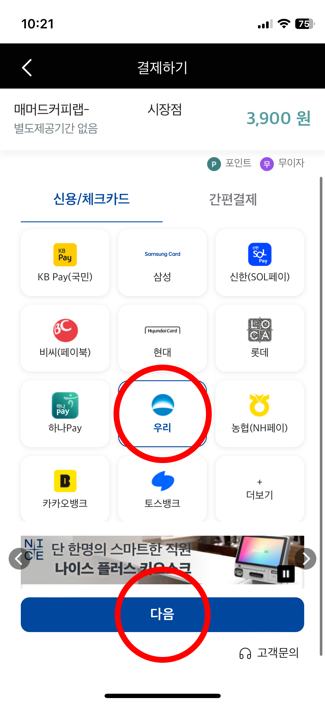 10. 우리은행 앱으로 연결하여 은행 앱 결제 비밀 번호만 클릭 후 스마트폰으로 간단히 결제를 진행했습니다.