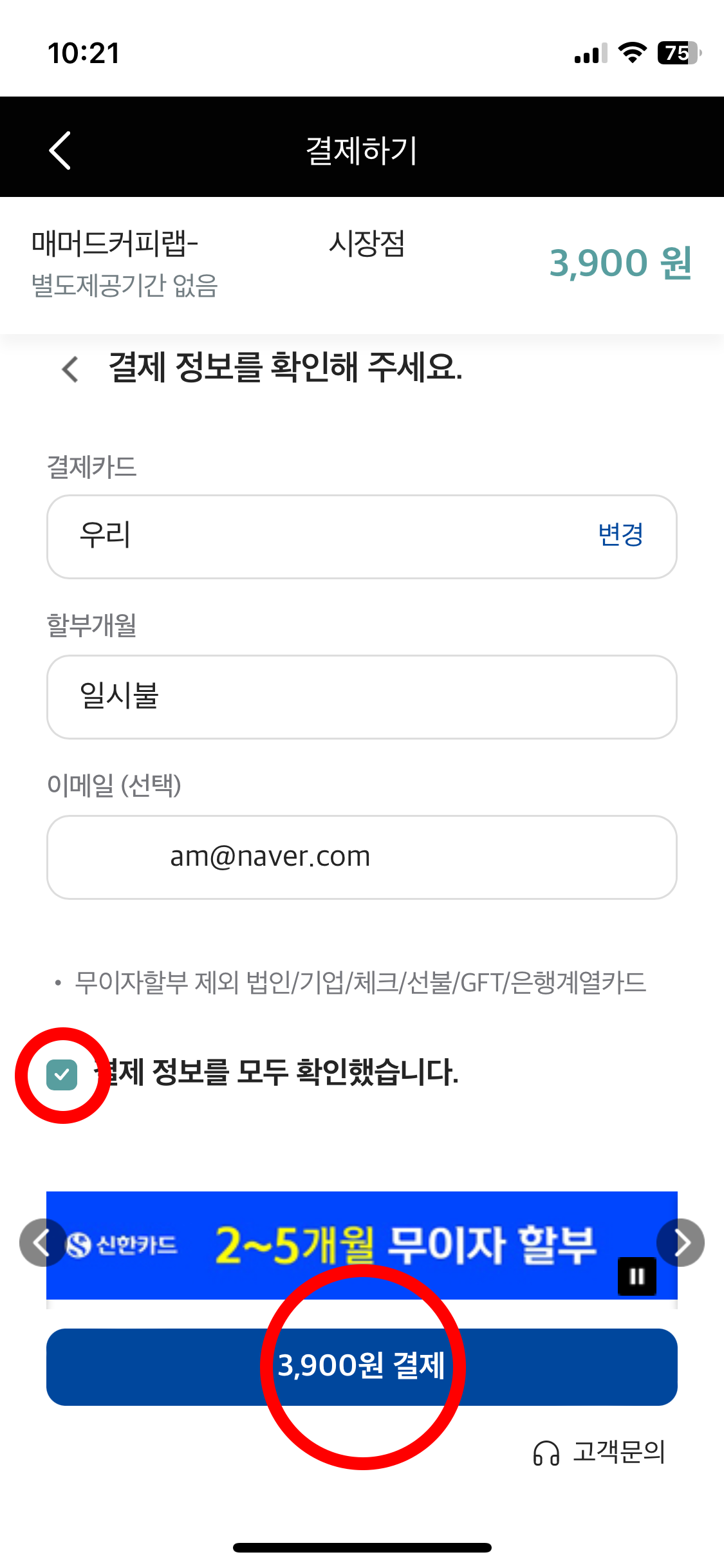 9. 결제 정보 확인 후, 결제 금액 (3,900원) 결제를 터치합니다.