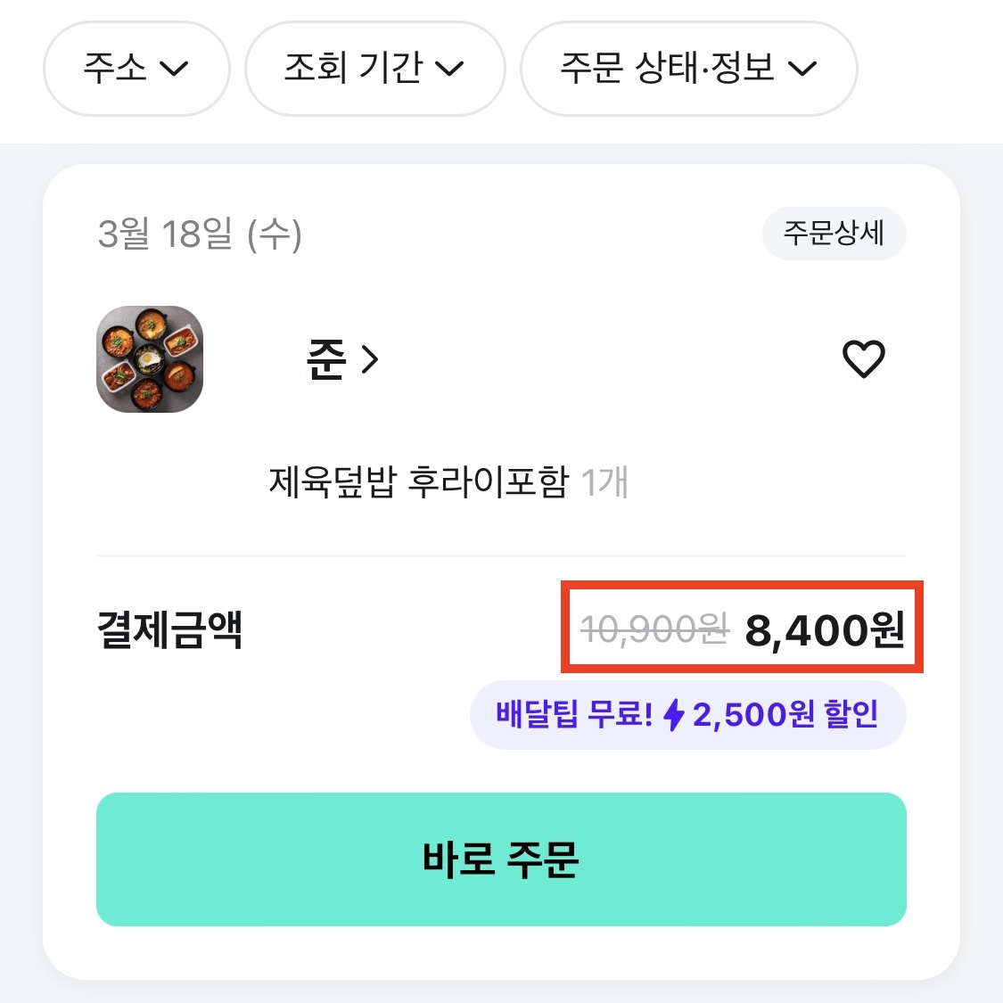 제육덮밥을 분명히 이래 저래 할인을 받고 8,400원에 주문을 했는데, 문제 메시지 알람으로 온 결제 내역은