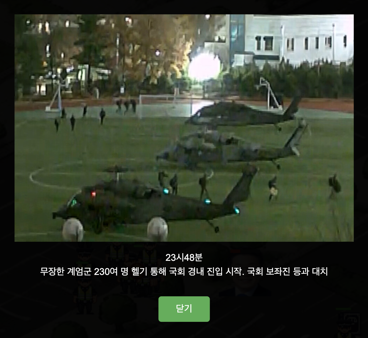 시간이 좀 더 지나면 계엄 사령부에서 포고령 1호가 발표되고 무장한 계엄군들이 헬기를 통해 국회 진입을 시작하며 국회 보좌진 등과 대치합니다. 포고령이 발표되면 플레이어인 캐릭터가 더욱 위험해집니다. 공격에 닿으면 게이지가 떨어지고 게임 오버하게 됩니다.