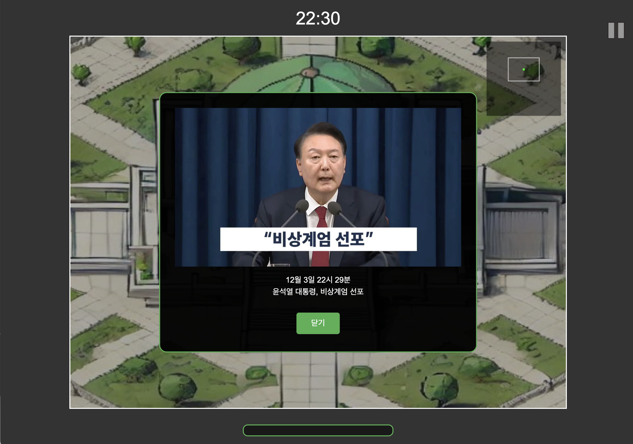 저는 계속 패배했습니다. 실제로 국회에서 계엄을 해제한 것은 얼마나 다행이며 얼마나 긴박했을까요? 그날의 일들을 시간 경과에 따라 게임으로 느껴볼 수 있습니다.