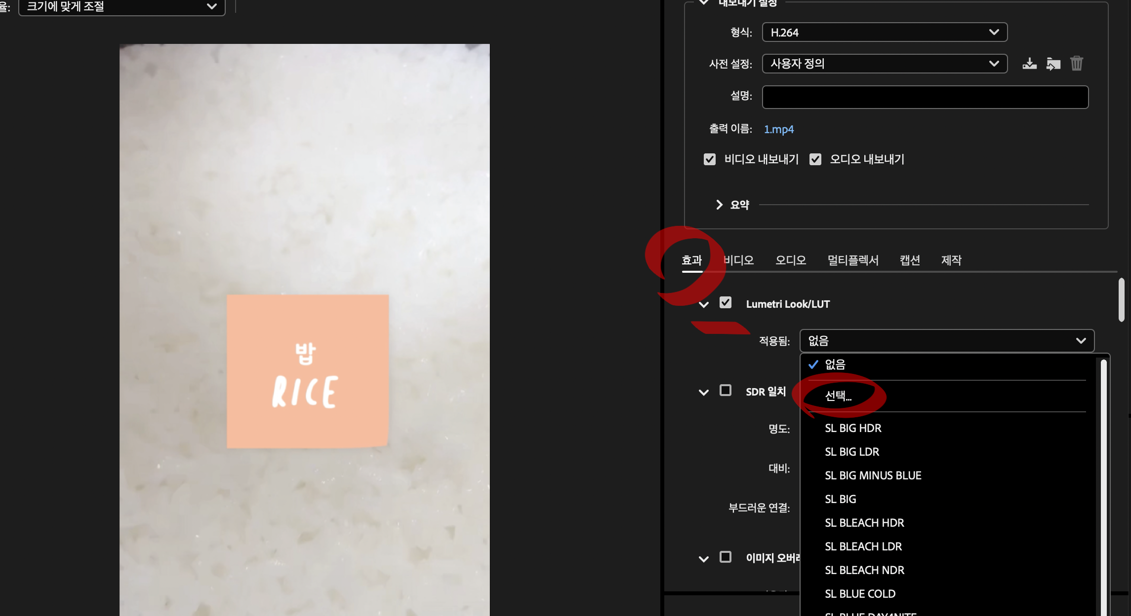 3. 효과 부분에서 Lumetri Look/LUT 체크박스에 체크를 하고 적용됨 메뉴에서 선택을 클릭해 다운로드 받은 파일을 불러옵니다.