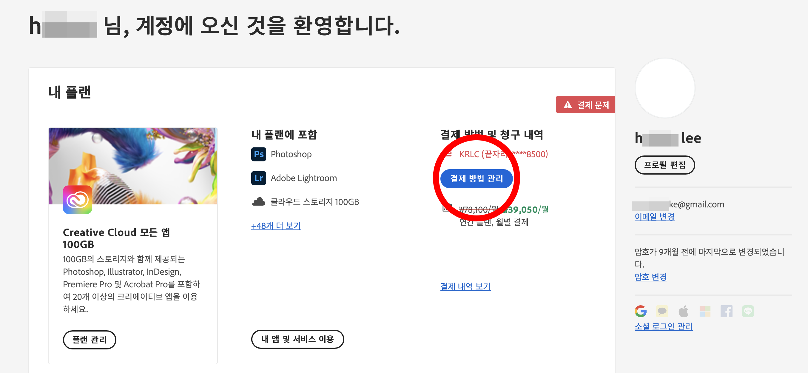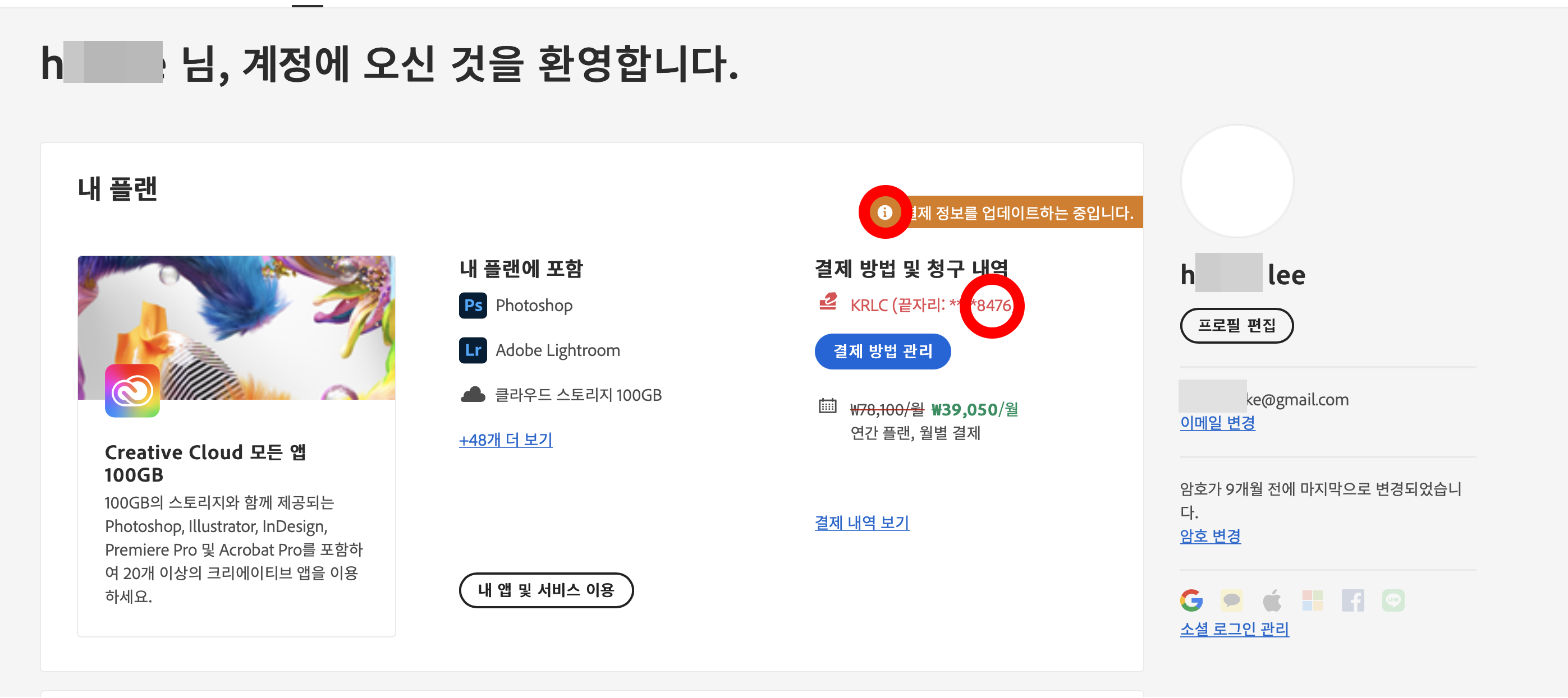 (저는 기존에 사용하던 카드를 잃어버려서, 어도비 구독 해당 월 결제일에 돈이 빠져나가지 못해서, 연체 금액이 접수되었다는 메시지가 뜨고 말았습니다.)