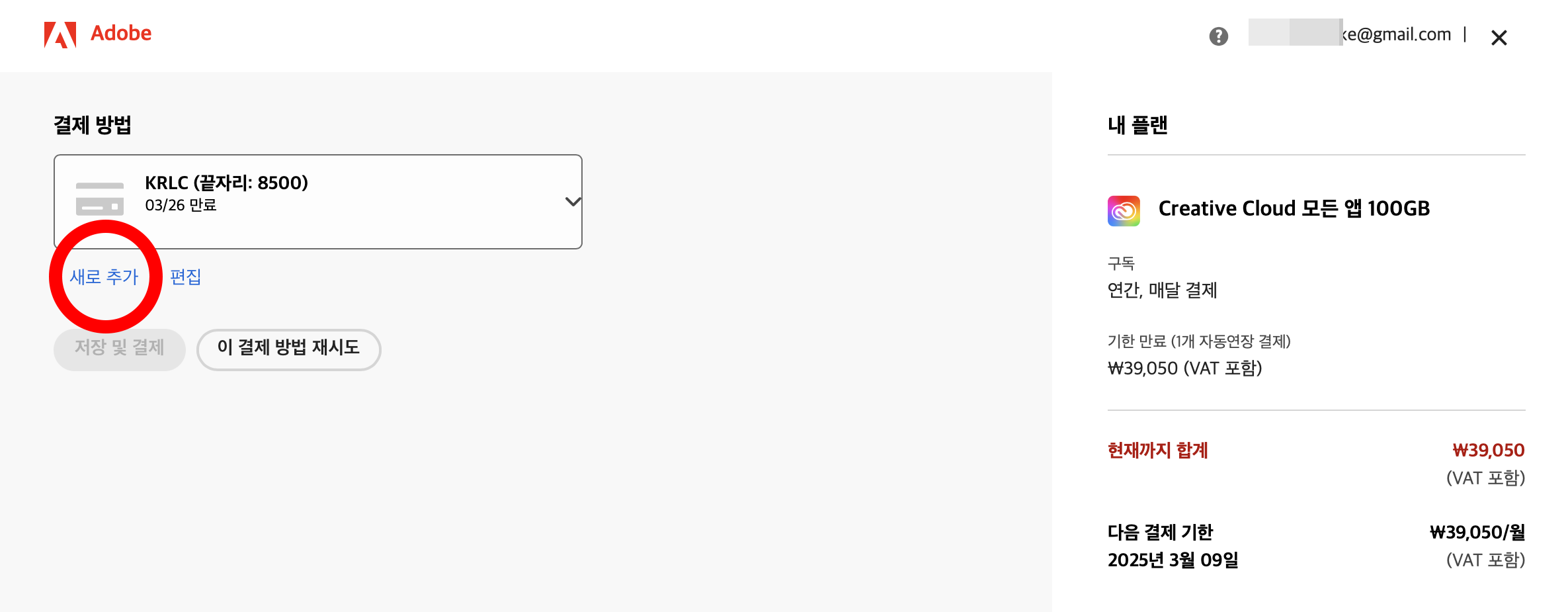 3. 새로 추가를 클릭하고, 새로운 결제 카드를 등록하고, 새로 등록한 카드를 결제할 카드로 체크해서 선택한다.