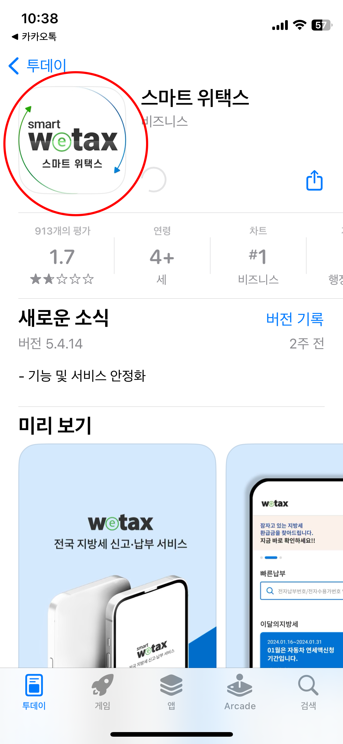 애플 앱스토어에서 위택스 앱을 다운받을 수 있는 화면이 나타나서 바로 다운로드하고 실행했습니다.
