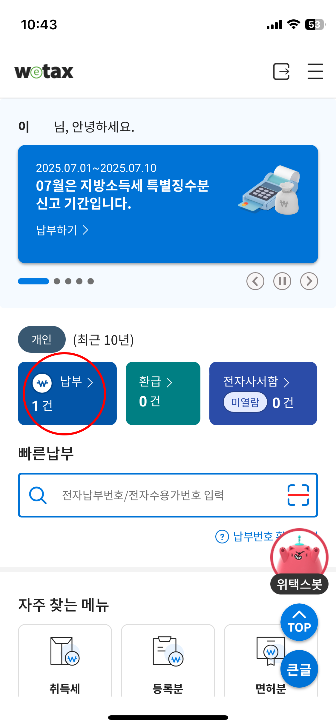 이전에도 이 앱을 한 번 사용한 적이 있는지 회원가입이 되어 있어서 로그인을 했습니다. 로그인을 하니, 화면에 중간에 납부할 1건이 있음을 확인할 수 있었습니다. 납부 1건 부분을 선택했습니다.