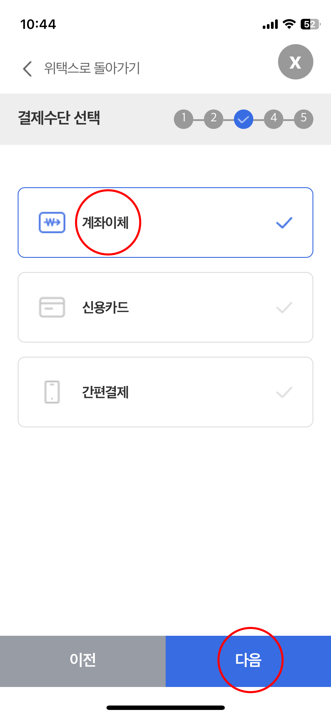 다음으로 납부할 방법을 선택하면 되었는데요. 저는 계좌이체를 선택하고 다음을 클릭했습니다.