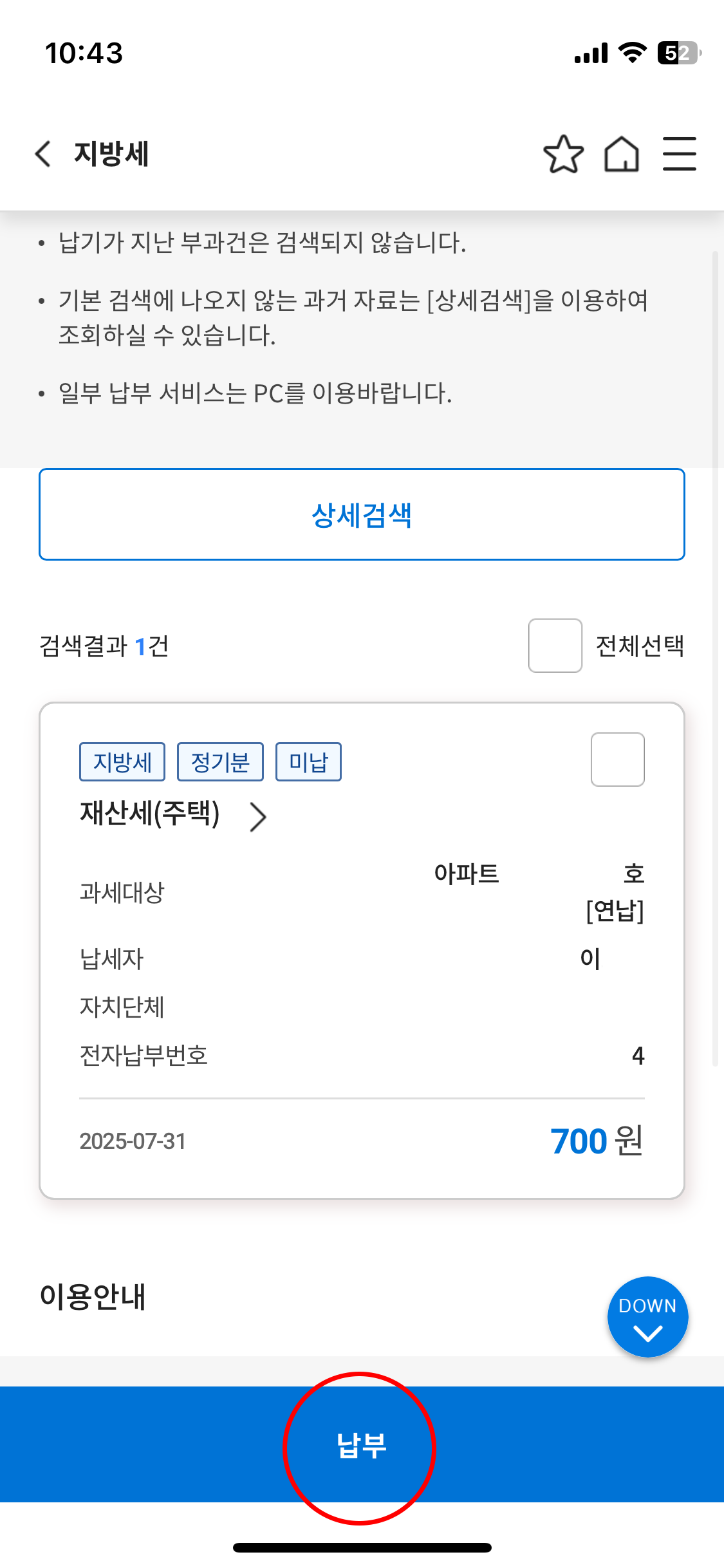 주택에 대한 재산세 미납분이 나와 있었습니다. 납부를 선택 (클릭) 했습니다.