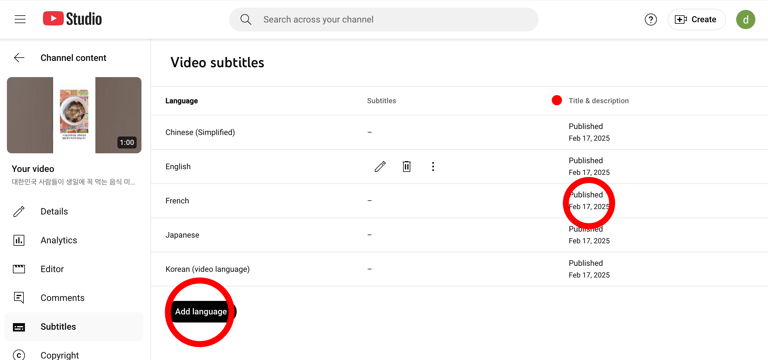 (언어를 한 번도 해본 적이 없으면 거의 언어 항목 (Language)에는 한국어 또는 영어로 하나의 언어만 있을 겁니다. 저는 이 영상에 영어, 프랑스어, 일본어, 중국어를 추가했고 한국어까지 하면 총 5개국어의 언어로 표시되게 했습니다. 모든 언어마다 개별로 일일이 설정을 해야하는데, 프랑스어 언어 설정 화면으로 설명드리겠습니다. title & description 부분에서 프랑스어에 해당하는 줄에 마우스 커서를 놓으면 연필 모양 아이콘의 수정 버튼이 뜹니다. 그것을 클릭합니다.)