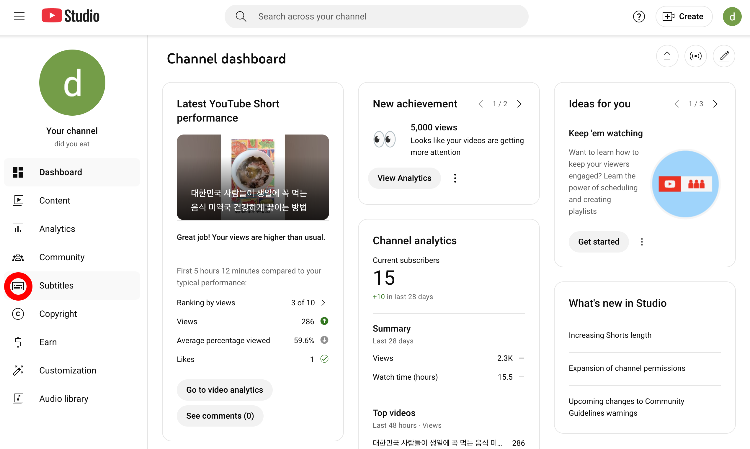 2. 유튜브 스튜디오에 들어와서 오른쪽 메뉴 중에 Subtitles (자막) 클릭.