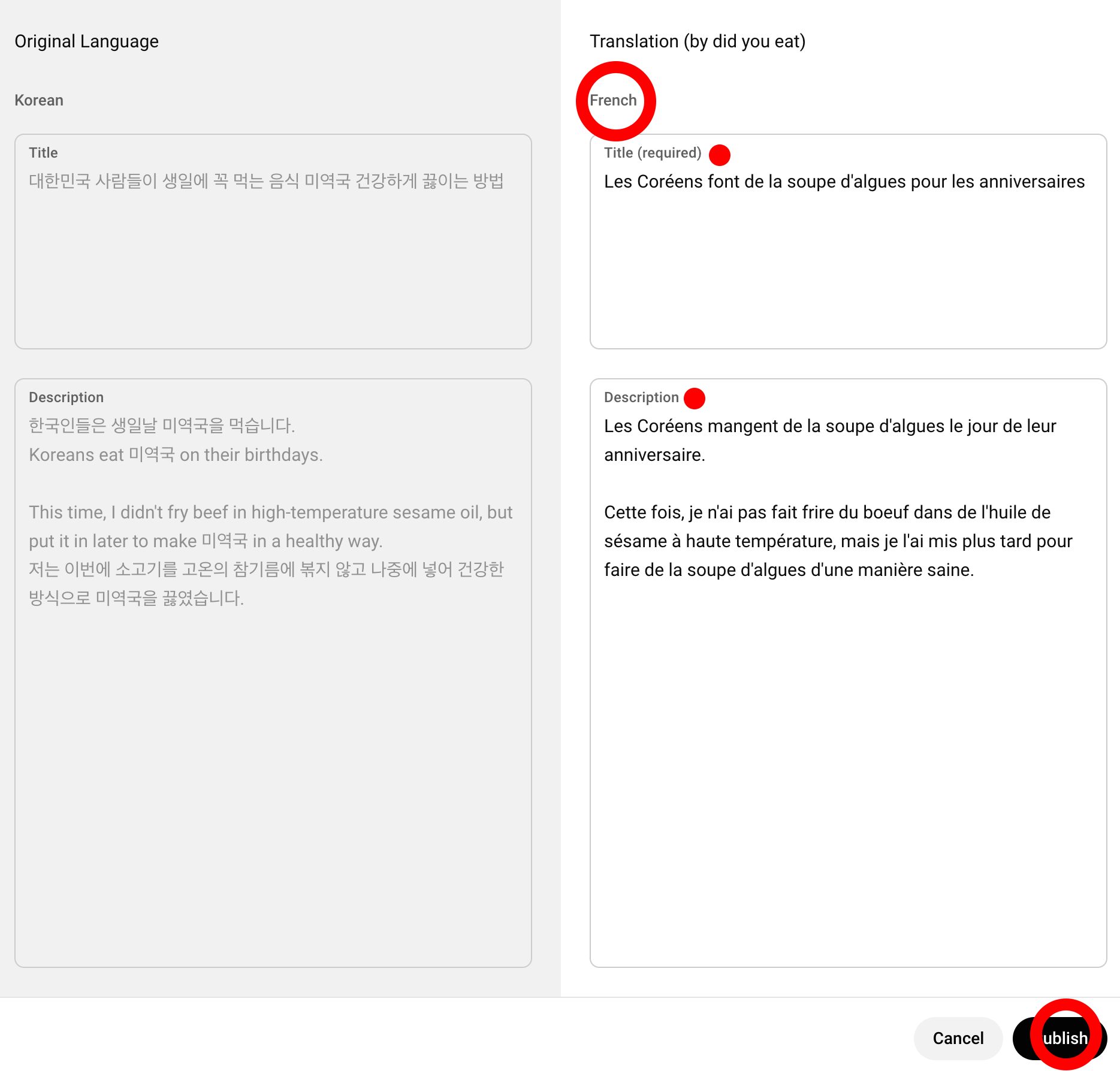 5. 창이 하나 뜹니다. 오른쪽은 오리지널 설정인 한국어가 떴고, 왼쪽에는 프랑스어가 뜨는데, 이곳은 처음에 내용이 없이 빈칸으로 되어 있습니다. title과 description 칸에 내용을 넣고 published (공개? 적용?)버튼을 클릭하면 언어 추가 설정이 완료됩니다.