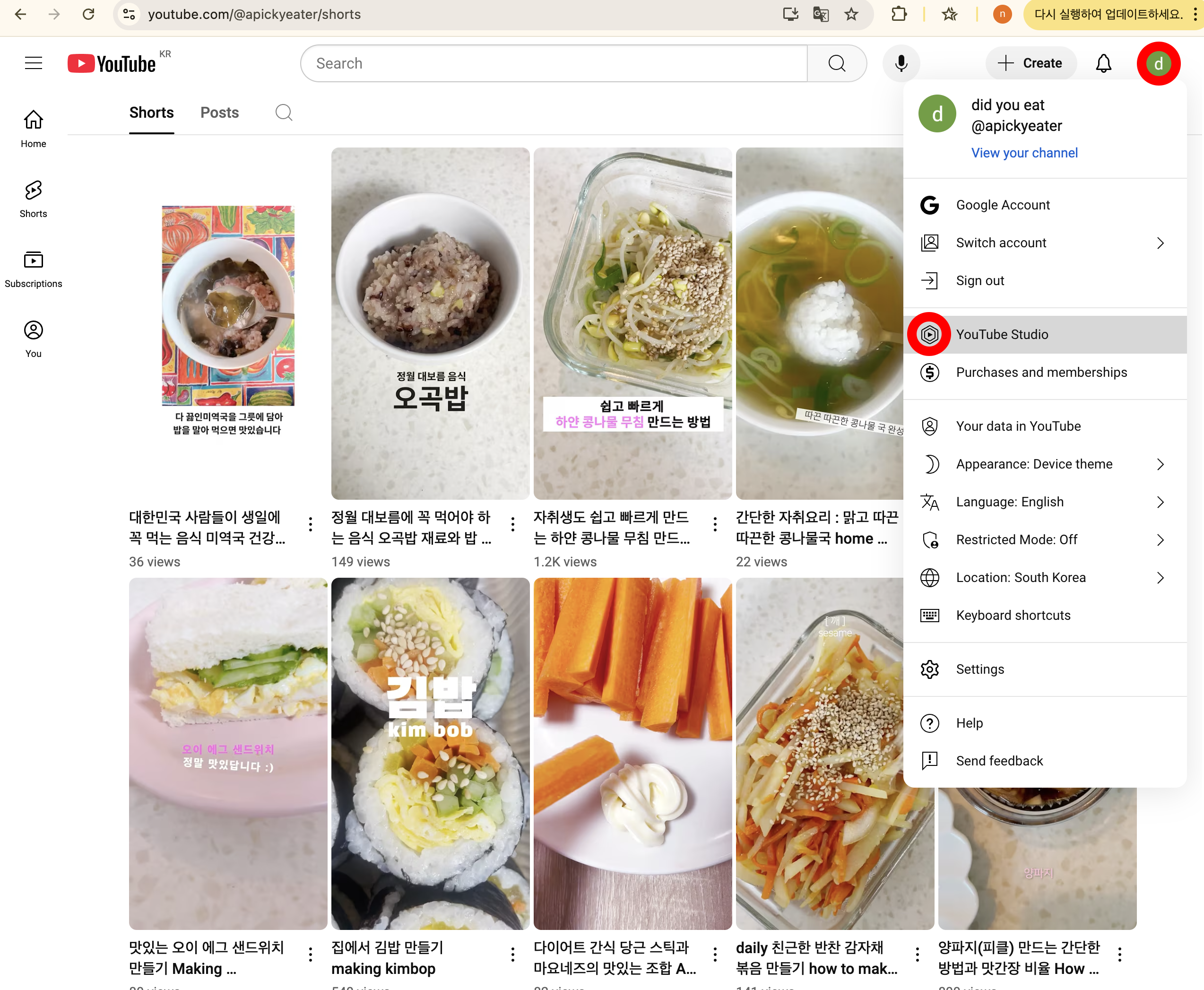 1. 자신의 채널 - 오른쪽 상단 프로필 썸네일 클릭 - 유튜브 스튜디오 클릭.