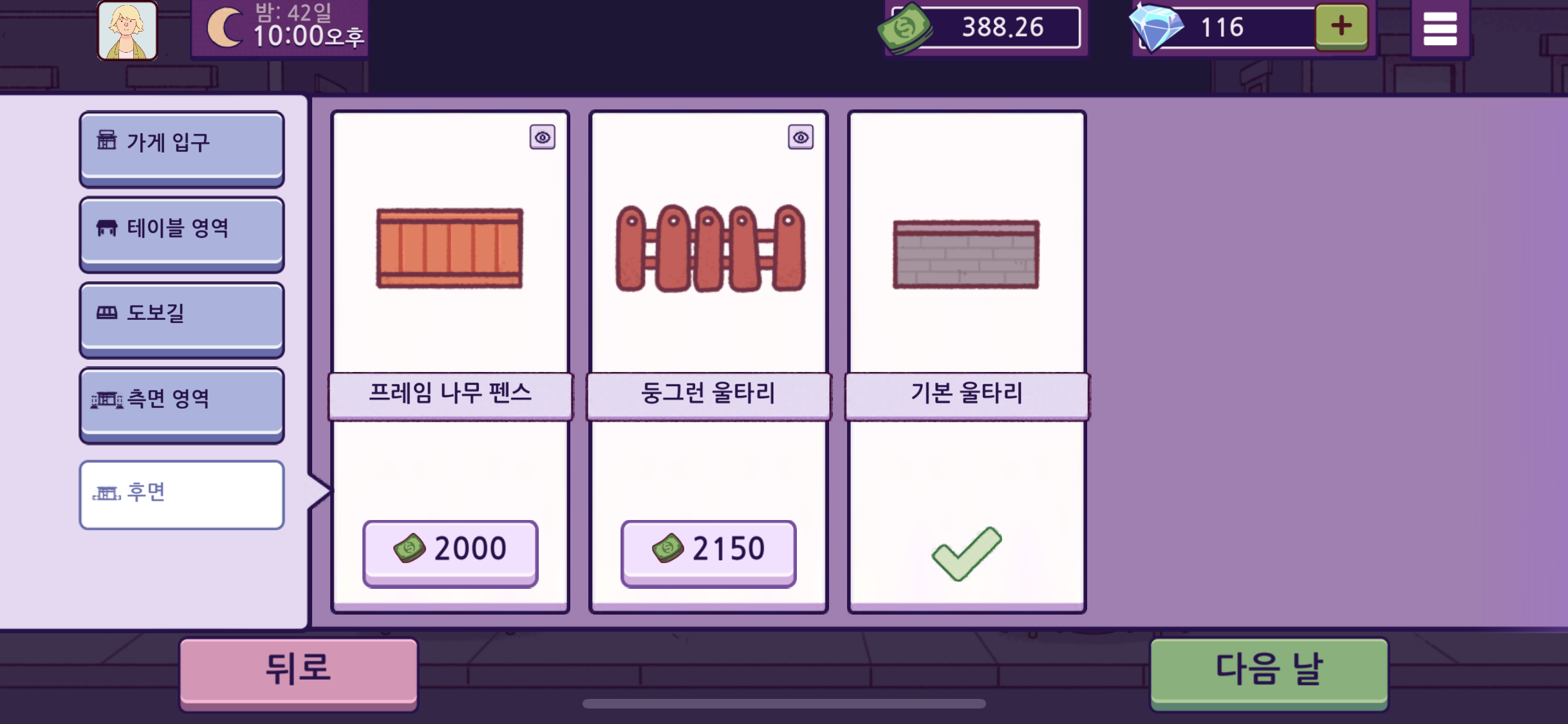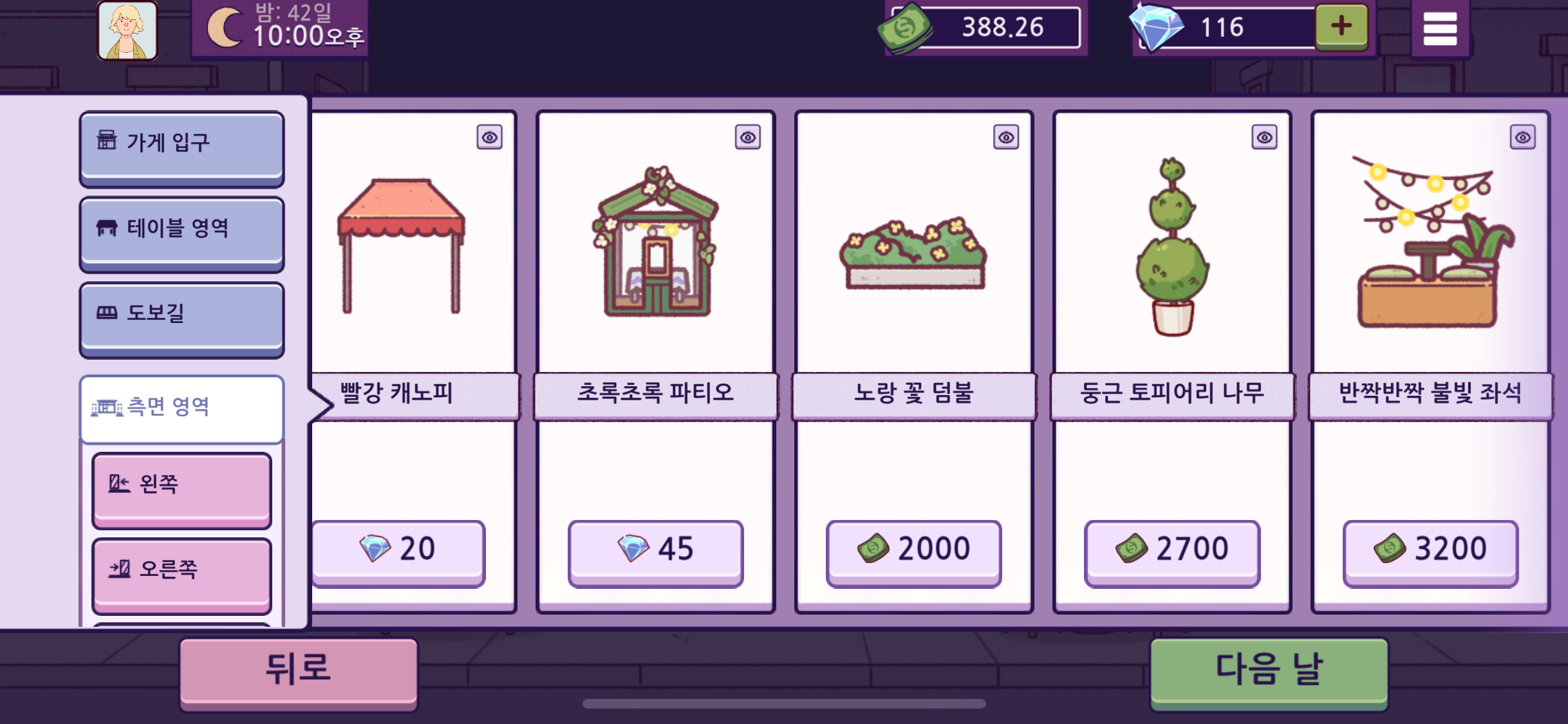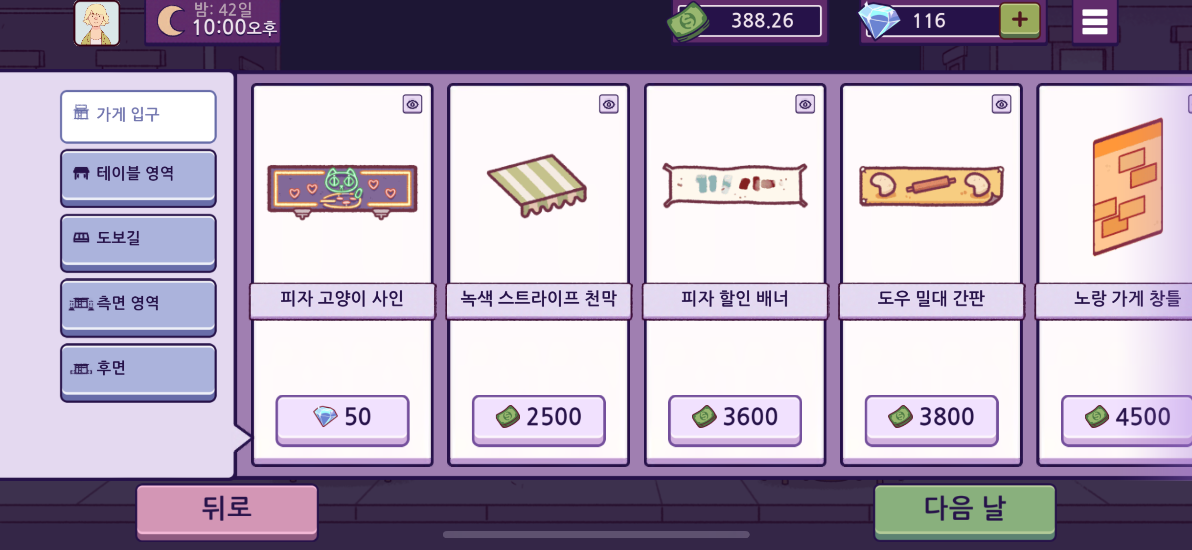 하루 치의 게임을 끝내고 일일 통계를 (매출 등) 확인 한 뒤에 위 화면과 같은 것을 볼 수 있습니다. 수리할 것은 수리하고 사야할 토핑은 사서 다음 날 장사 준비를 해야합니다. 이곳 왼쪽에 메뉴를 잘 보면 '외관'이라는 항목이 생겼습니다.