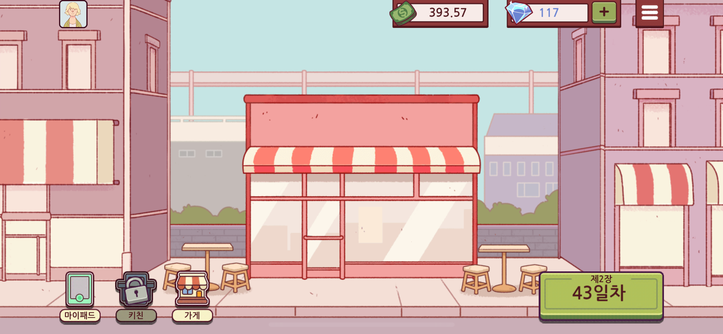 좋은 피자 위대한 피자에 홈 화면이 업데이트 되었습니다. 홈 화면이 이렇게 피자 가게 외관이 보여지는 배경으로 바뀌었고 이제부터 홈 화면에 보이는 외관을 꾸밀 수 있게 되었습니다. 한 눈에 볼 수 있는 사이즈의 외관의 모습이 무척 깜찍합니다. 참고로 위 배경은 기본 피자가게 모습입니다. 저는 아직 하나도 꾸미지 않았습니다.