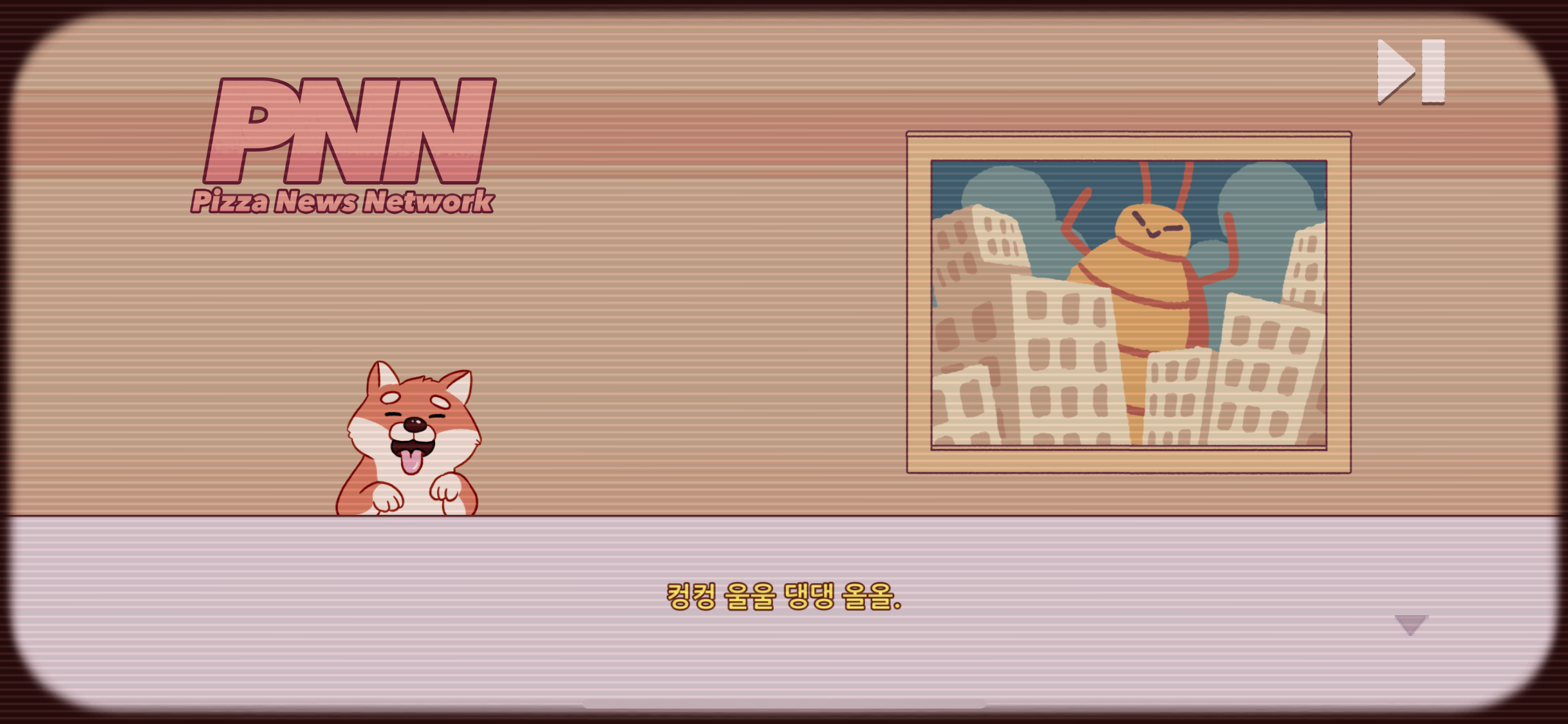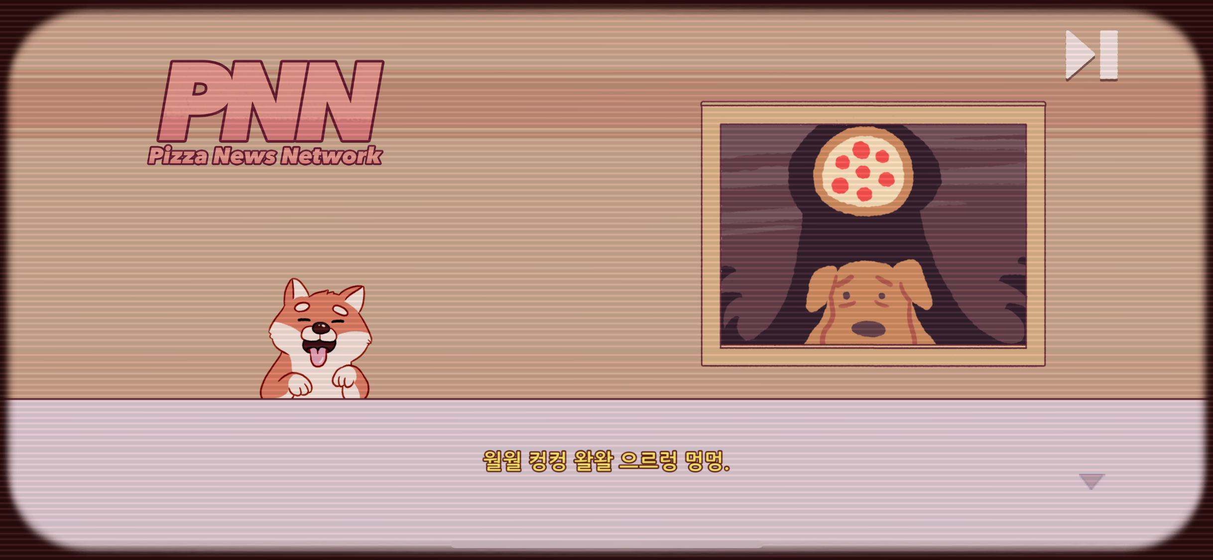 게임을 실행하면 제일 먼저 pizza news network라는 pnn 뉴스로 시작하는데, 웬일로 강아지 앵커가 나왔습니다. 뭐라고 뭐라고 여러 가지로 짖는데 귀여워서 저장했습니다.