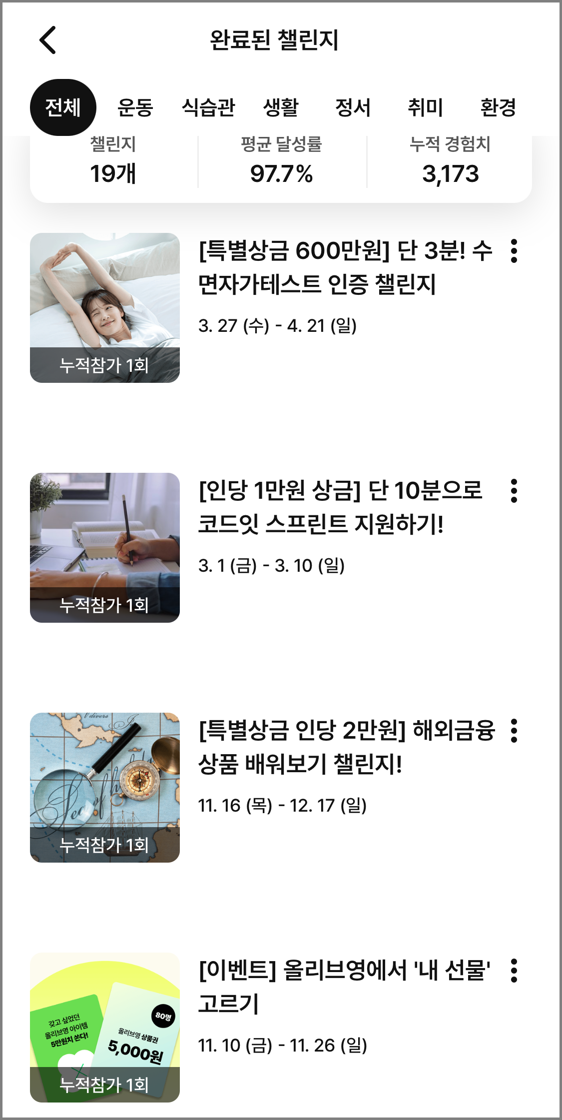 제가 참가한 챌린지들이 타임라인 순서로 정렬되어 있습니다. 제가 가장 많이 참가한 챌린지는 미라클모닝 챌린지로 누적 참가 7번을 했습니다. 아침 5시에서 7시 사이에 일어나 아침에 한 일을 앱 내장 카메라로 찍어 인증하는 챌린지였습니다. 제가 자주 참가한 챌린지는 조금이라도 상금이 걸려서 동기부여도 되고 앱테크도 되는 것들 위주였습니다.