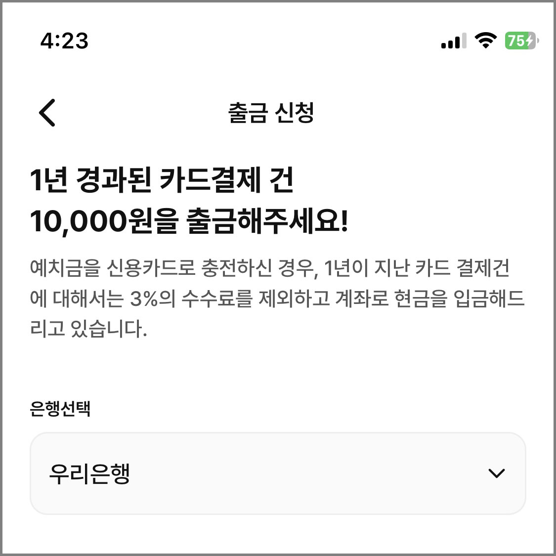 기본적으로 예치금은 전액 출금이 가능한데, 예치금을 결제한지 1년이 경과된 카드결제 건에 대해서는 3%의 수수료가 붙는다는 안내가 나와 있습니다. 그래서 1만원 중 수수료 300원을 제외하고 9,700원을 출금 신청했습니다.