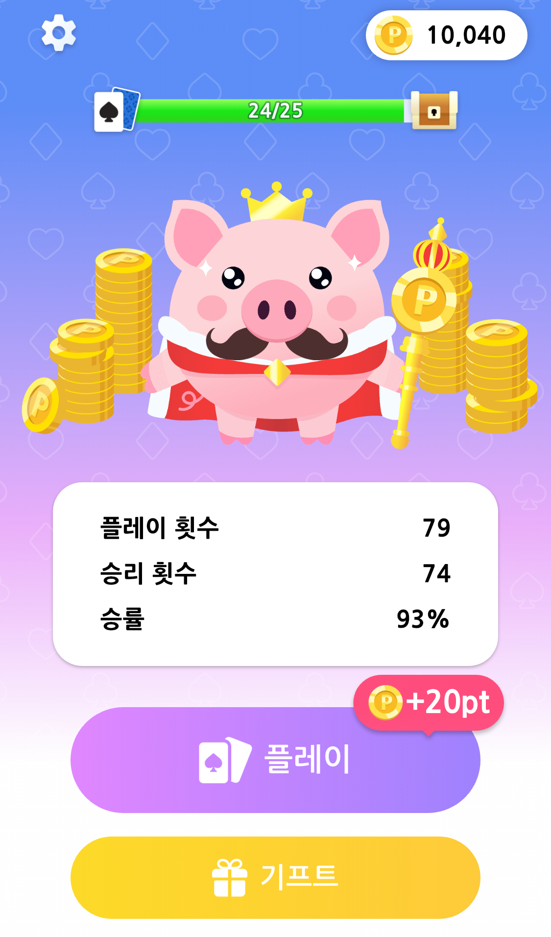 10000포인트를 모으기까지 79번의 플레이를 했고, 74번의 승리를 해서 승률은 93%로 끝냈습니다.