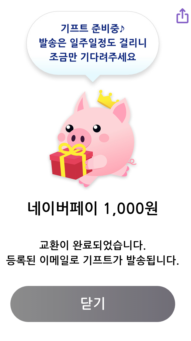 특이하게도 기프트는 등록된 메일로 발송된다고 하네요. 선물을 들고 뛰어 오는 돼지 캐릭터가 정말 귀엽습니다.