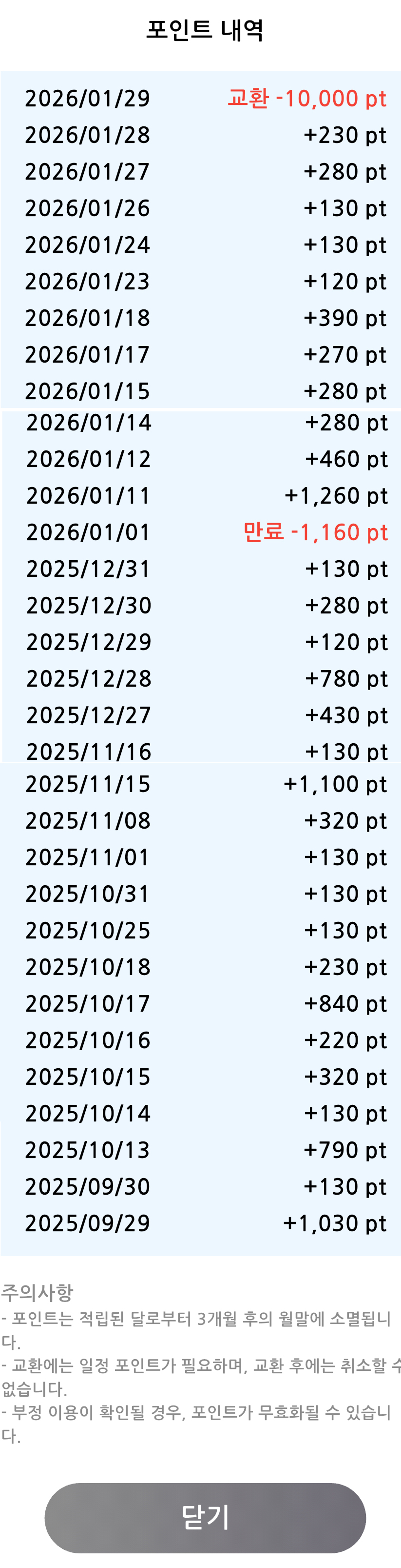 2025년 9월29일부터 2026년 1월 29일까지 플레이하여 4개월을 꼬박 플레이하여 10000포인트를 모았지만 실질적으로는 1000원을 모았습니다. 아주 비효율적인 앱테크였습니다. 포인트는 3개월 후에는 소멸이 되어서 저는 중간에 피같은 1160포인트를 잃었습니다.