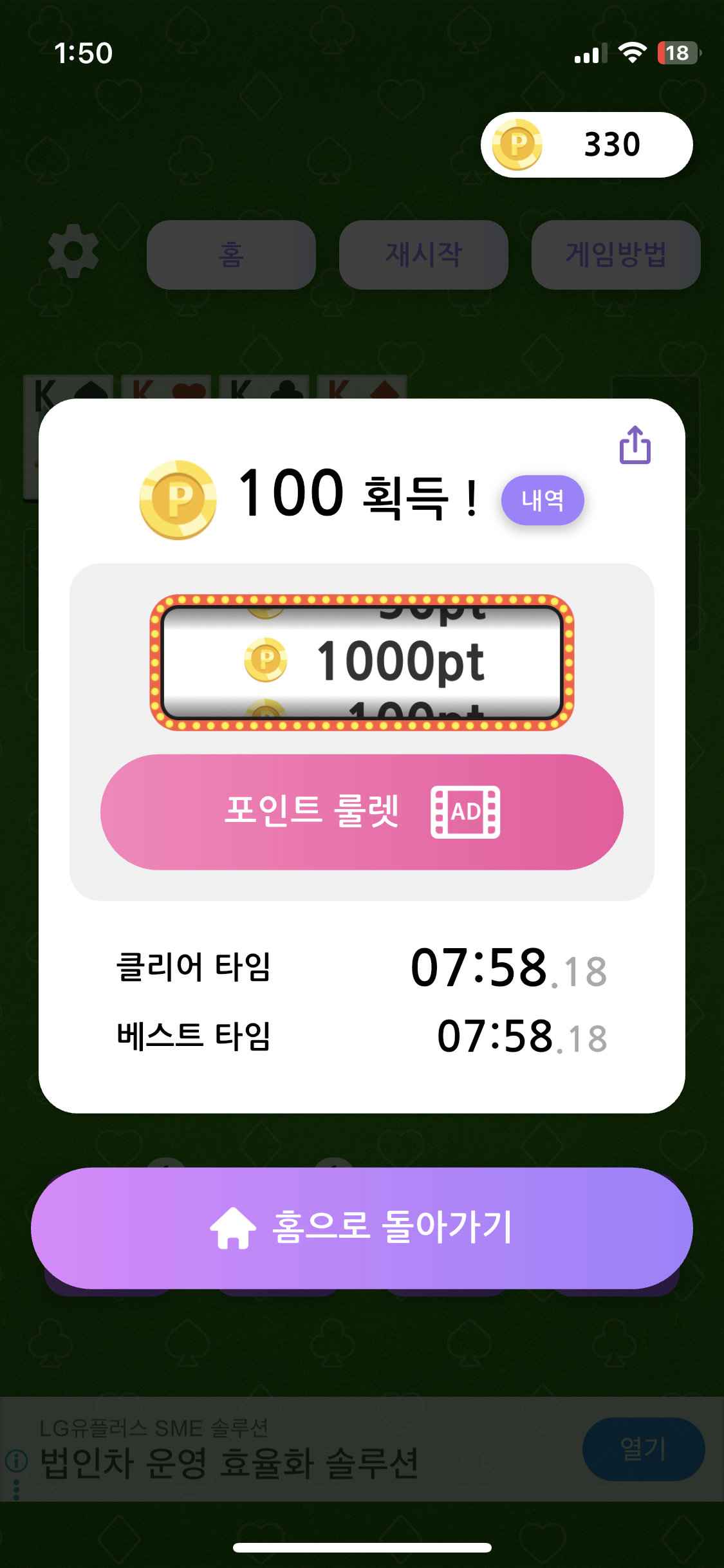 캐시솔리테어의 단점이 있다면 광고가 많이 뜨고 광고 건너 뛰기가 없다는 점입니다.