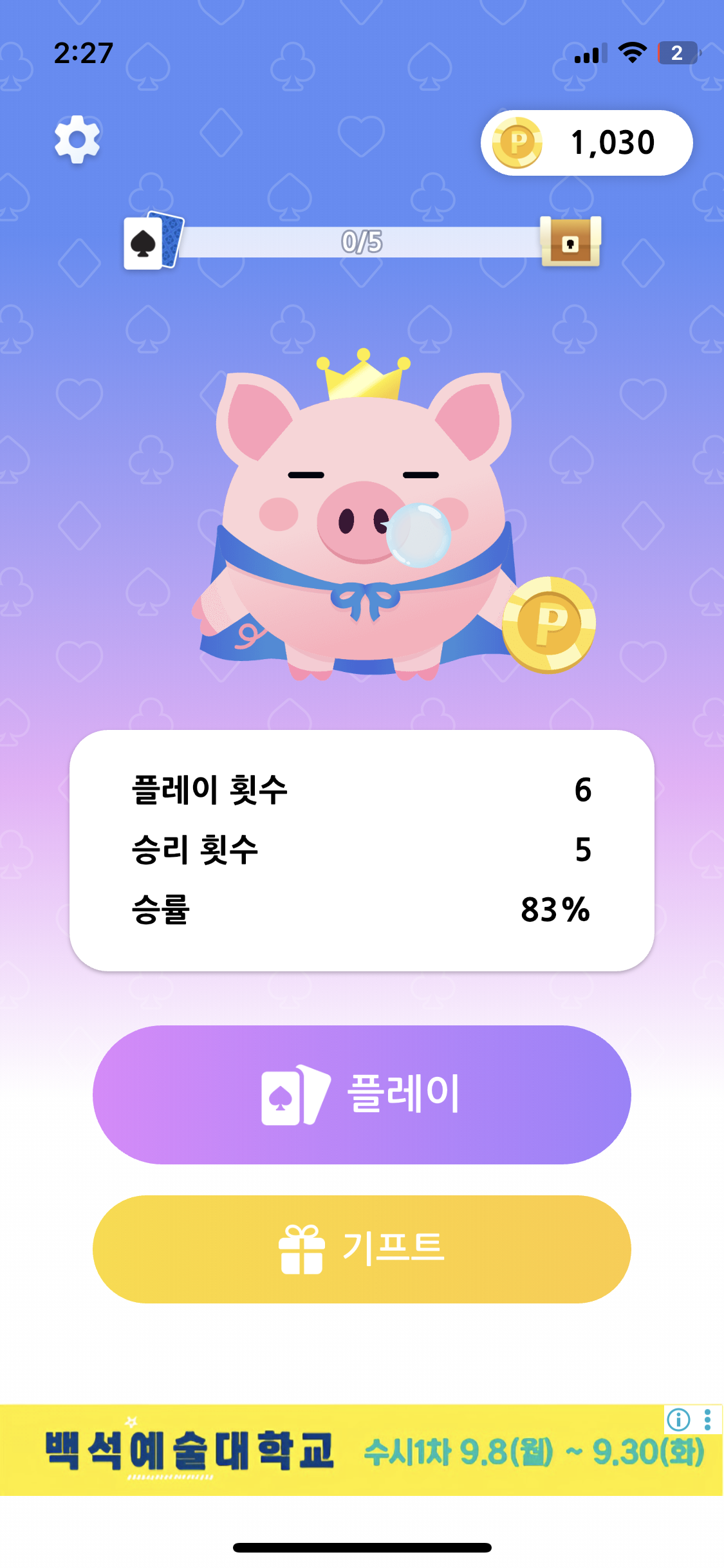 홈화면에서는 게임 전적과 쌓은 포인트를 확인할 수 있습니다. 저는 5게임을 승리했고, 1030포인트를 얻었습니다.