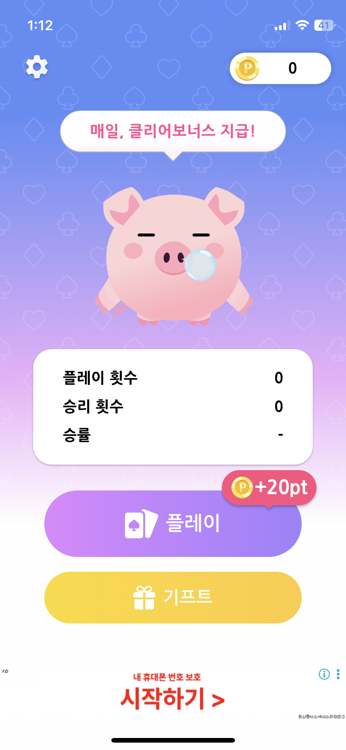 먼저 이 앱의 홈 화면인데요. 제가 아직 플레이를 하지 않은 상태가 고스란히 보여지는 화면입니다.