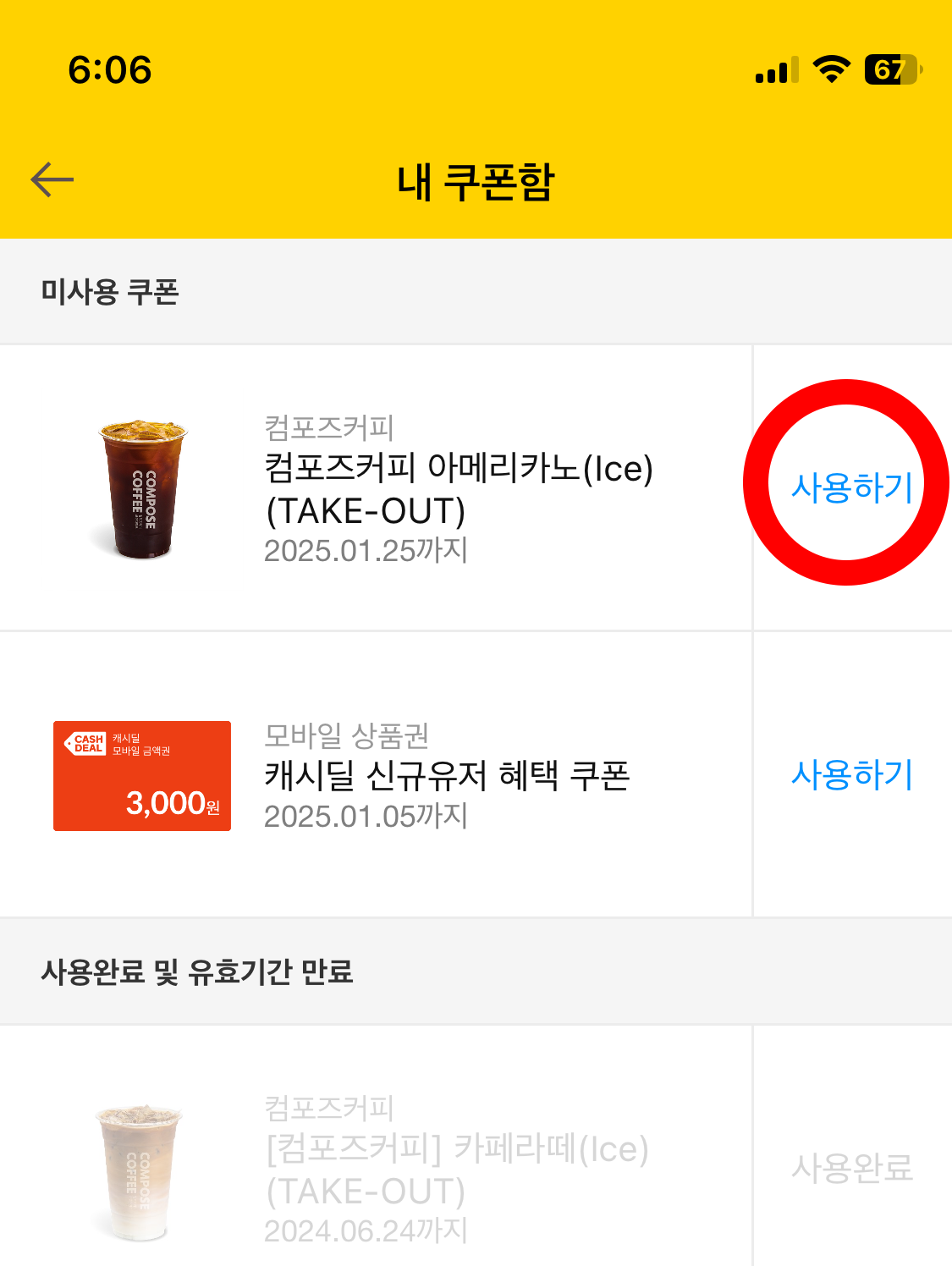 그럼 내 쿠폰함 화면이 나오는데요. 사용하기를 클릭합니다.